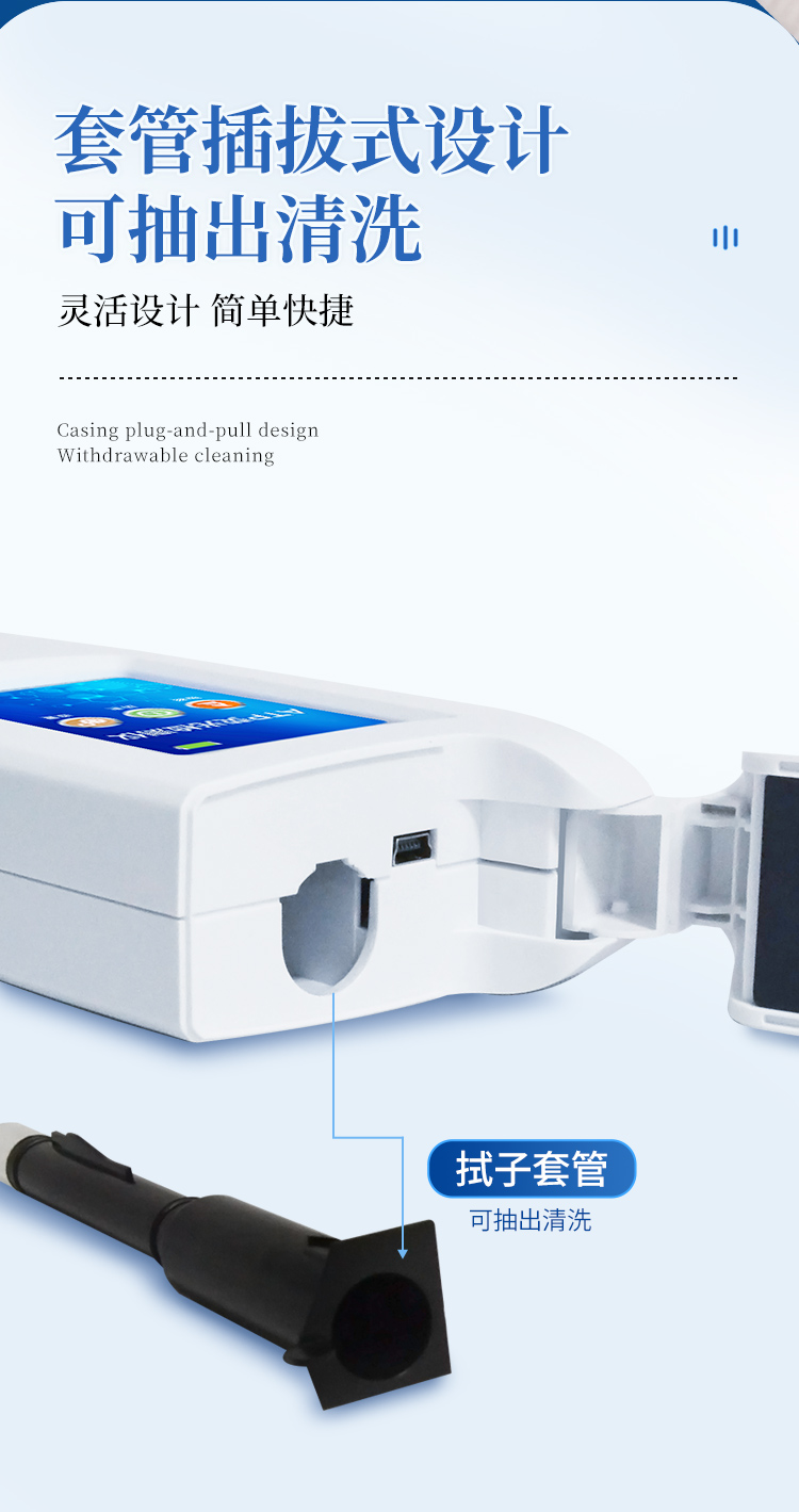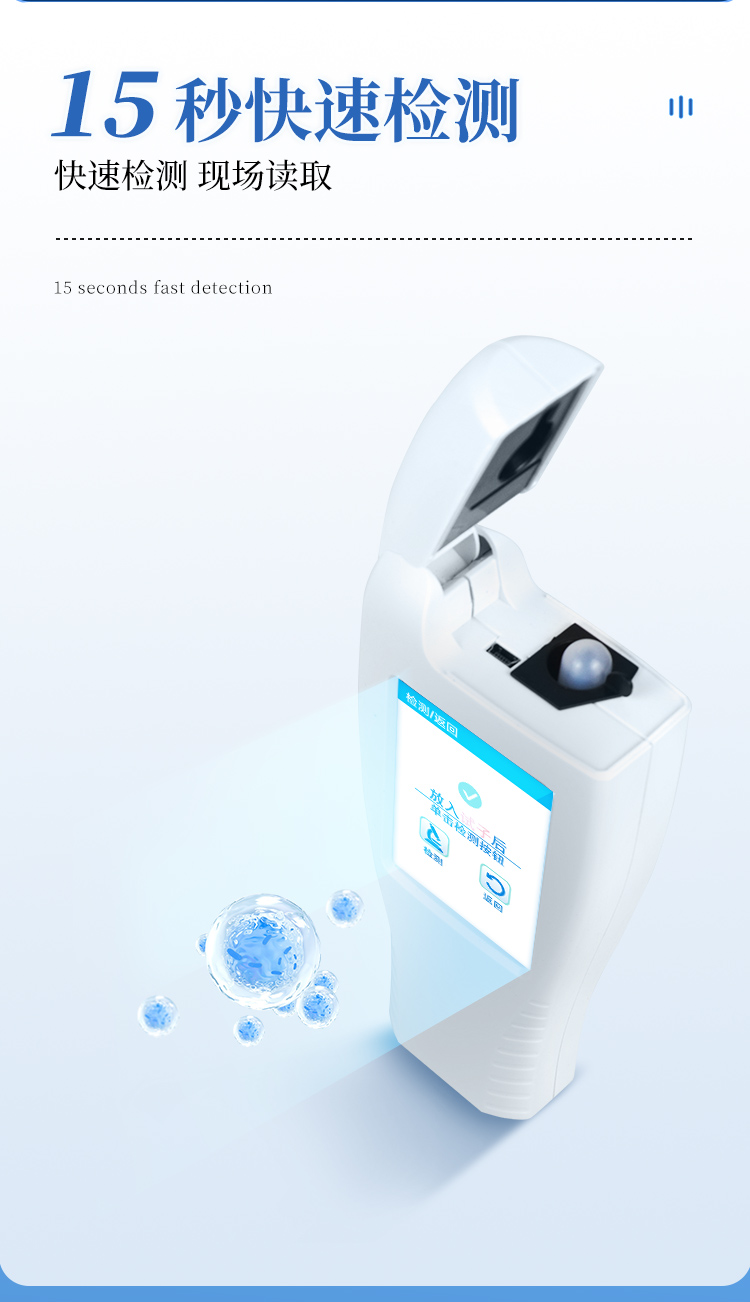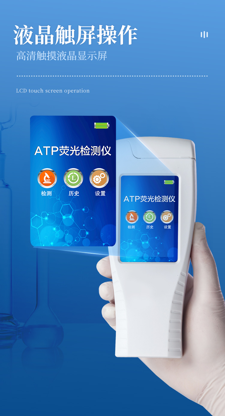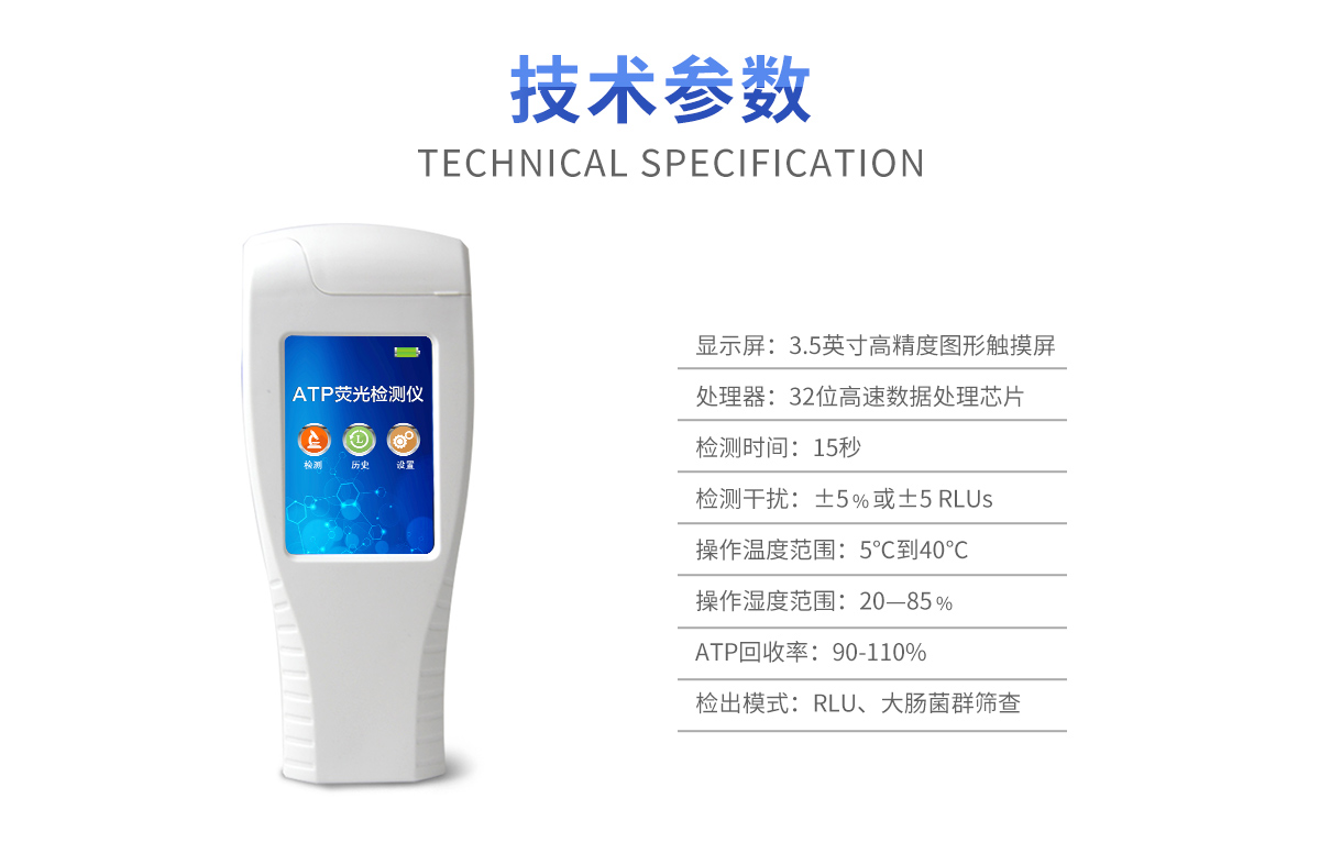 該設備采用生物化學反應方法檢測ATP含量,細菌檢測儀基于螢火蟲發光原理,利用“熒光素酶—熒光素體系”快速檢測三磷酸腺苷(ATP)。ATP拭子含有可以裂解細胞膜的試劑,能將細胞內ATP釋放出來,與試劑中含有的特異性酶發生反應,產生光,再用熒光照度計檢測發光值,微生物的數量與發光值成正比,由于所有生物活細胞中含有恒量的ATP,所以ATP含量可以清晰地表明樣品中微生物與其他生物殘余的多少,用于判斷衛生狀況。