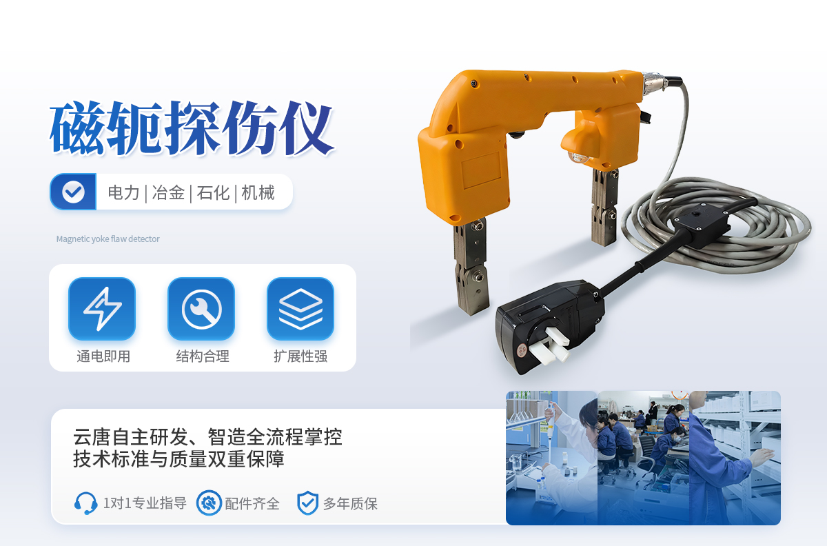 該儀器磁化電源具有電池電量顯示功能,方便用戶觀察電池電量并及時(shí)充電。電磁軛采用高導(dǎo)磁芯、一體化線圈,重量輕,使用壽命長。采用高能鋰電池供電,電池電量大,使用時(shí)間長,特別適合高空作業(yè)、鍋爐、壓力容器內(nèi)部結(jié)構(gòu)的磁粉探傷,解決了現(xiàn)場無電源的麻煩,提高了工作時(shí)的安全系數(shù),降低工作人員的勞動(dòng)強(qiáng)度。