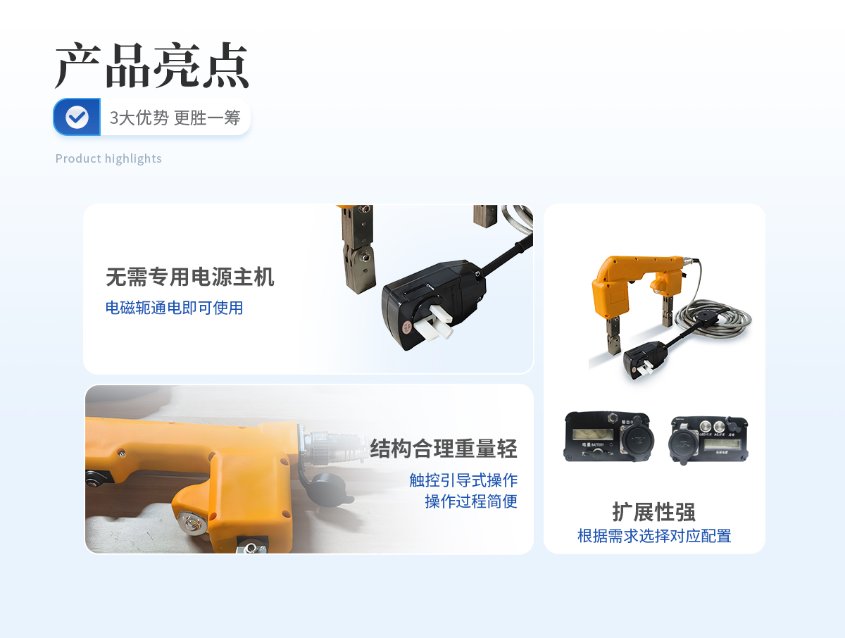 YT-CTS-N型電磁軛磁粉探傷儀,無主機(jī)設(shè)計(jì),采用逆變交流鋰電池供電,無需外接電源即可產(chǎn)生交流磁場。核心部分采用單片機(jī)控制,輸出**、穩(wěn)定??筛鶕?jù)工件的厚度自動(dòng)調(diào)整輸出電流,減少了開環(huán)電流大和發(fā)熱的問題 。輸出功率強(qiáng)勁,檢測靈敏度高,操作方便,結(jié)構(gòu)緊湊、布局合理、體積小巧、重量輕、攜帶方便等特點(diǎn)。