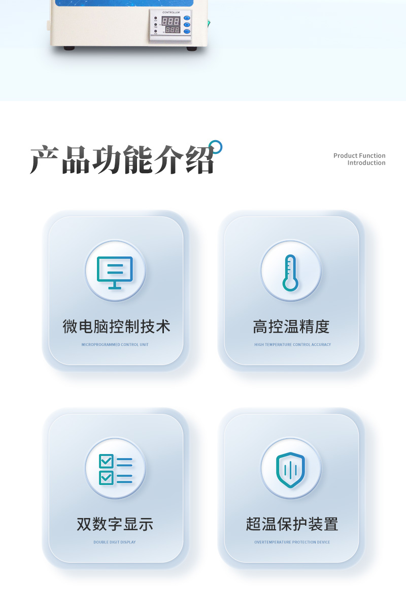 6.智能數(shù)字溫控器,可定時,雙數(shù)字顯示,調(diào)節(jié)采用PID技術(shù)并可實現(xiàn)超溫報警及防干燒。