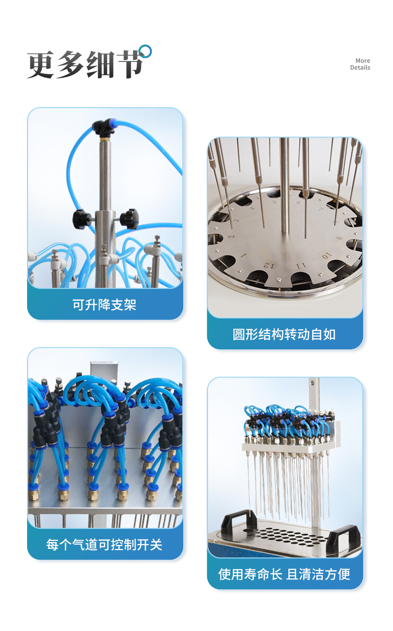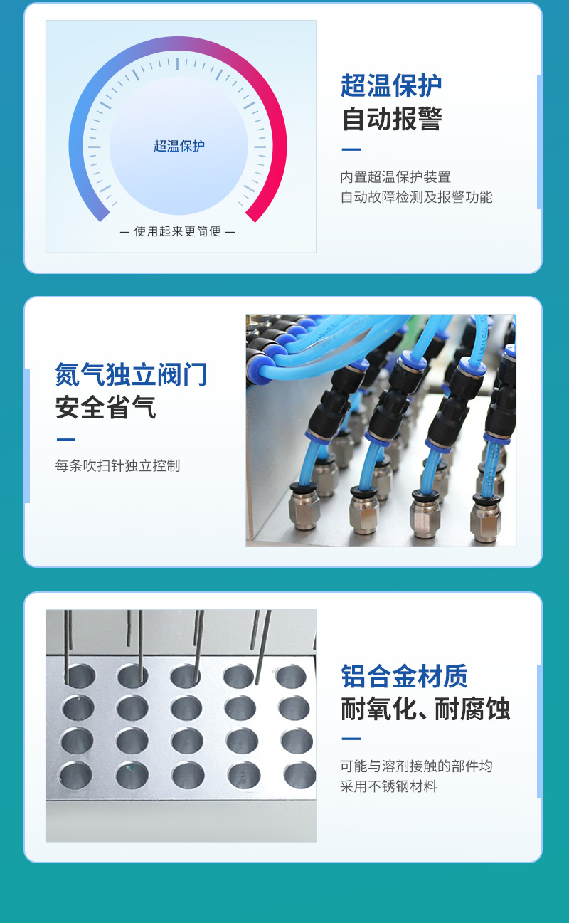 3、氮吹儀有36個氣道控制開關,節約氣體,每根吹氣針的位置可獨立改變吹掃位置,使之適用不同的樣品容器及不同的樣品位置