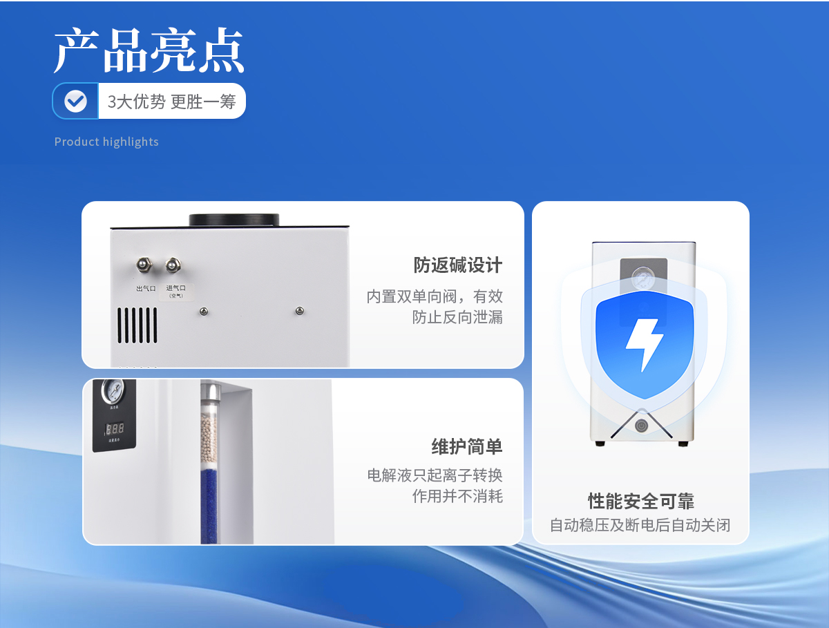 1、可取代高壓氮氣瓶,使實驗室儀器化。    2、操作簡便,只需啟動電源開關,儀器即可產氮且輸出壓力穩定。    3、不消耗電解液;電解液只起離子轉換作用并不消耗,所以只需補充因蒸發而損失的少量蒸餾水。    4、產氣純度高,空氣經電解池分離后即可得到高純氮氣。    5、性能安全可靠:具有穩壓和斷電后自動關閉氣路功能。    6、壽命長,既可間斷使用,又可連續使用且產氣量穩定、不衰減。    7、**節能:采用**的開關電源,提高了電解效率。    8、配有雙單向閥,自動防返堿。