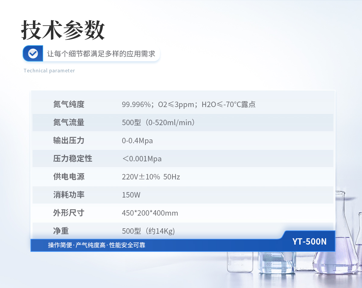 1、氮氣純度: 99.996%;O2≤3ppm;H2O≤-70℃露點    2、氮氣流量: 500型(0-520ml/min)    3、輸出壓力: 0-0.4Mpa    4、壓力穩定性:<0.001Mpa    5、供電電源: 220V±10% 50Hz    6、消耗功率: 150W    7、外形尺寸: 450*200*400mm    8、凈重: 500型(約14Kg)