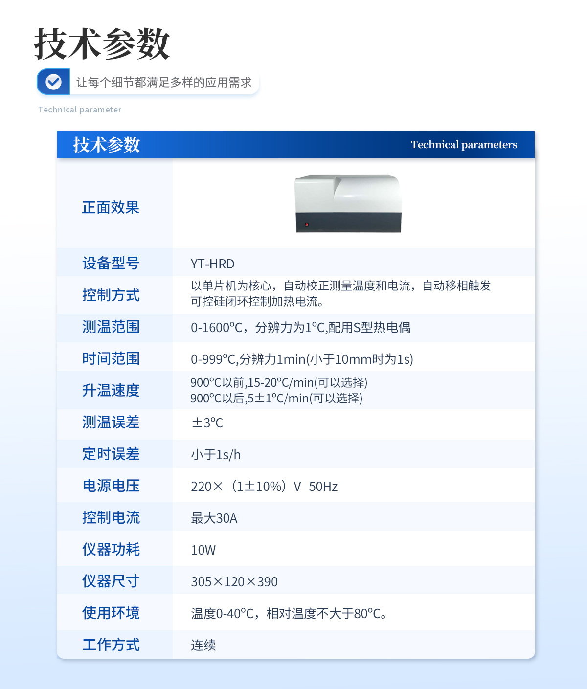 | 1、控制方式:以單片機(jī)為核心,自動(dòng)校正測(cè)量溫度和電流,自動(dòng)移相觸發(fā)可控硅閉環(huán)控制加熱電流。 | 2、測(cè)溫范圍:0-1600oC,分辨力為1oC,配用S型熱電偶. | 3、時(shí)間范圍:0-999oC,分辨力1min(小于10mm時(shí)為1s) | 4、升溫速度:900oC以前,15-20oC/min(可以選擇).900oC以后,5±1oC/min(可以選擇) | 5、測(cè)溫誤差:±3oC | 6、定時(shí)誤差:小于1s/h | 7、電源電壓:220×(1±10%)V 50Hz | 8、控制電流:**30A | 9、儀器功耗:10W | 10儀器尺寸(mm):305×120×390 | 11、使用環(huán)境:溫度0-40oC,相對(duì)溫度不大于80oC | 12、工作方式:連續(xù) |