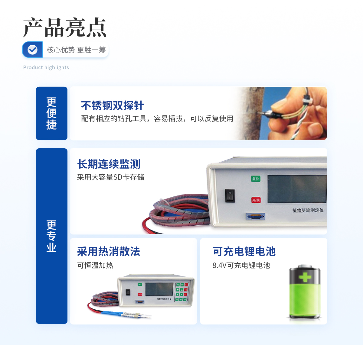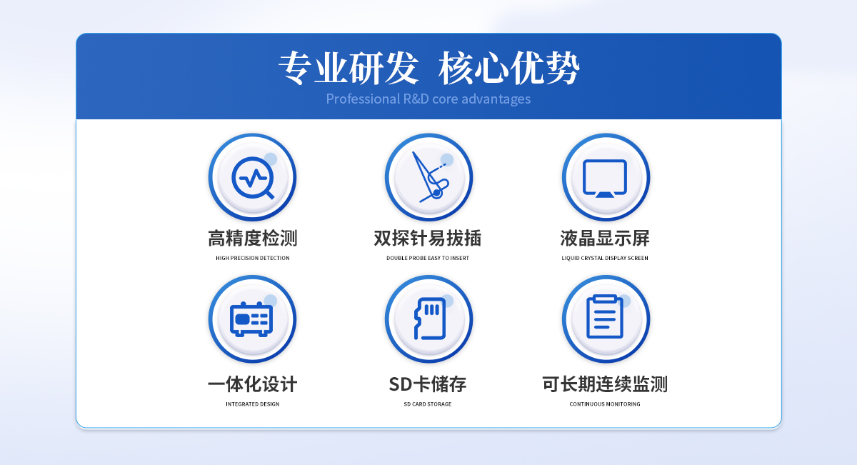 雙探針,配有相應(yīng)的鉆孔工具,容易插拔,可以反復(fù)使用 采用熱消散法,可恒溫加熱 可以長(zhǎng)期連續(xù)監(jiān)測(cè) 不銹鋼探針,采用Teflon涂層,持久耐用 采用高精度T型熱電偶直接與數(shù)據(jù)分析儀連接 采用大容量SD卡存儲(chǔ)