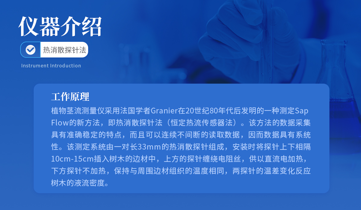 植物莖流測(cè)量?jī)x采用法國(guó)學(xué)者Granier在20世紀(jì)80年代后發(fā)明的一種測(cè)定Sap Flow的新方法,即熱消散探針法(恒定熱流傳感器法)。該方法的數(shù)據(jù)采集具有準(zhǔn)確穩(wěn)定的特點(diǎn),而且可以連續(xù)不間斷的讀取數(shù)據(jù),因而數(shù)據(jù)具有系統(tǒng)性。該測(cè)定系統(tǒng)由一對(duì)長(zhǎng)33mm的熱消散探針組成,安裝時(shí)將探針上下相隔10cm-15cm插入樹木的邊材中,上方的探針纏繞電阻絲,供以直流電加熱,下方探針不加熱,保持與周圍邊材組織的溫度相同,兩探針的溫差變化反應(yīng)樹木的液流密度。