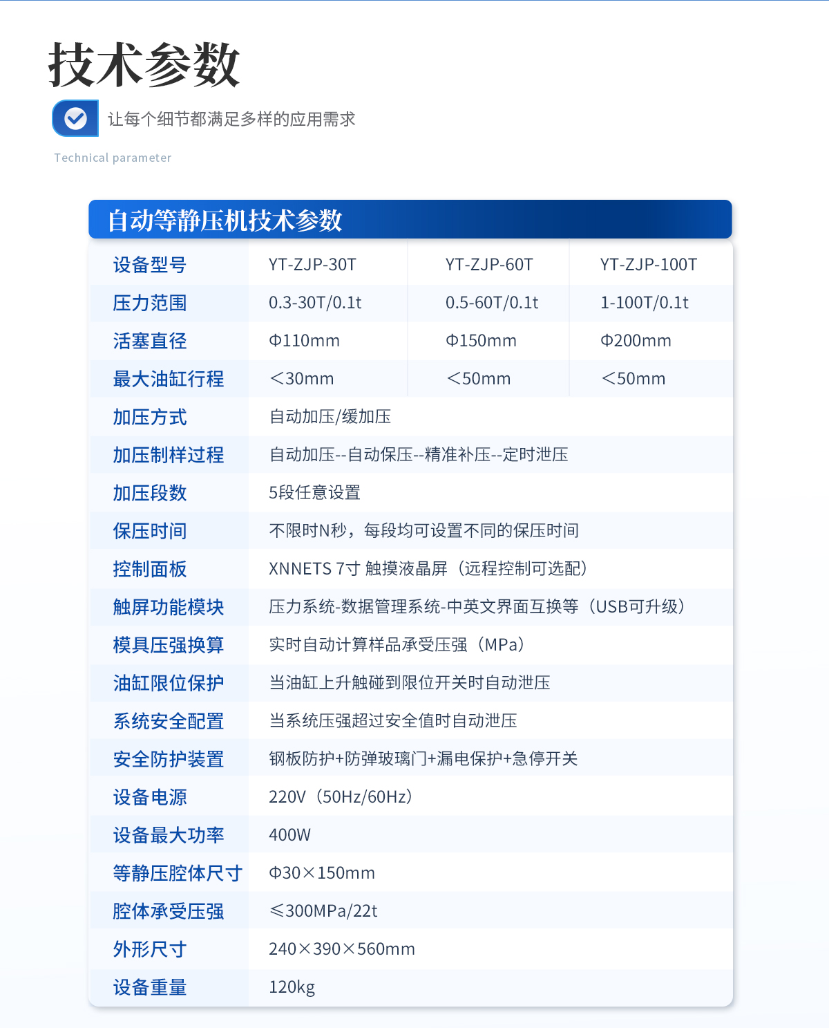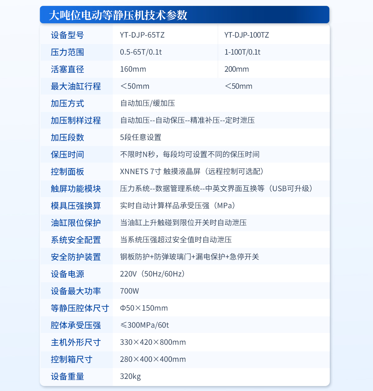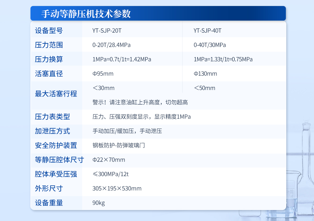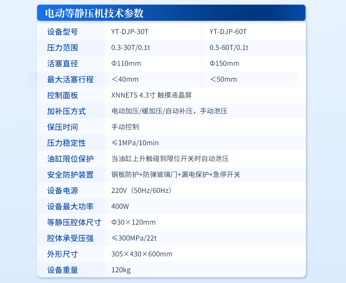| 規格型號:YT-DJP-65TZ | 壓力范圍:0.5-65T/0.1t | 活塞直徑 :160mm | **油缸行程:<50mm | 加壓方式:自動加壓/緩加壓 | 加壓制樣過程:自動加壓--自動保壓--精準補壓--定時泄壓 | 加壓段數:5段任意設置 | 保壓時間 :不限時N秒,每段均可設置不同的保壓時間 | 控制面板:XNNETS 7寸 觸摸液晶屏(遠程控制可選配) | 觸屏功能模塊:壓力系統-數據管理系統--中英文界面互換等(USB可升級) | 模具壓強換算:實時自動計算樣品承受壓強(MPa) | 油缸限位保護:當油缸上升觸碰到限位開關時自動泄壓 | 系統安全配置:當系統壓強超過安全值時自動泄壓 | 安全防護裝置:鋼板防護+防彈玻璃門+漏電保護+急停開關 | 設備電源:220V(50Hz/60Hz) | 設備**功率:700W | 等靜壓腔體尺寸:Φ50×150mm | 腔體承受壓強:≤300MPa/60t | 主機外形尺寸:330×420×800mm | 控制箱尺寸:280×400×400mm | 設備重量 :320kg | 配置說明:主機1臺,控制箱1臺,等靜壓腔體1套!可根據需求定制500MPa等靜壓機或橡膠模具 |