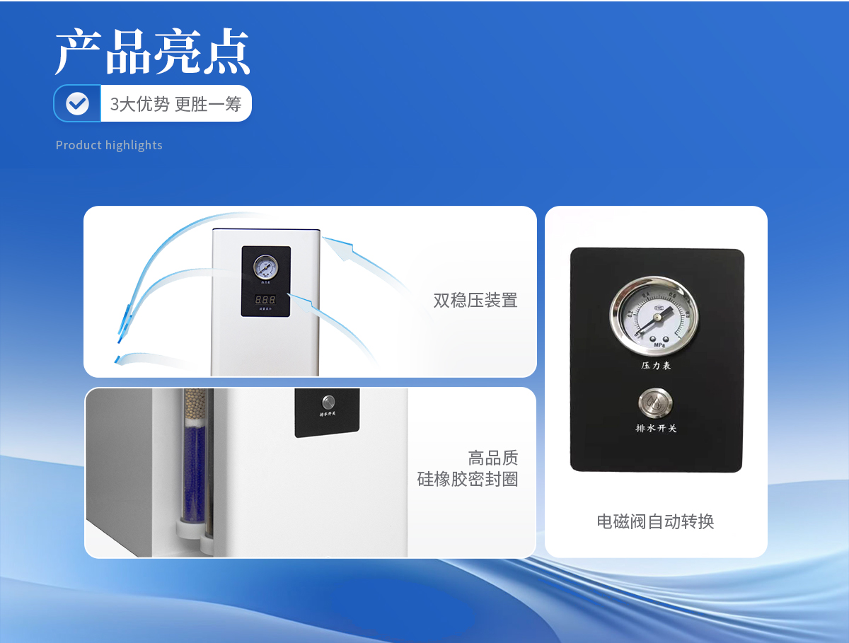 1、雙穩壓裝置,確保高精度穩壓條件下氣體流量的穩定性。    2、電磁閥自動轉換,徹底杜絕了電磁閥在自動放水時產生的連續噪音,實現放水、轉換一體化。    3、儀器內部采用硅橡膠圈,含硫量低有效提高氣體質量,保證色譜基線穩定。    4、體積小,雙支FV型亞克力過濾器,耐壓高,不會因工作環境及腐蝕氣體的影響,導致過濾管變形,開裂而產生漏氣現象,可持久使用,一勞永逸。