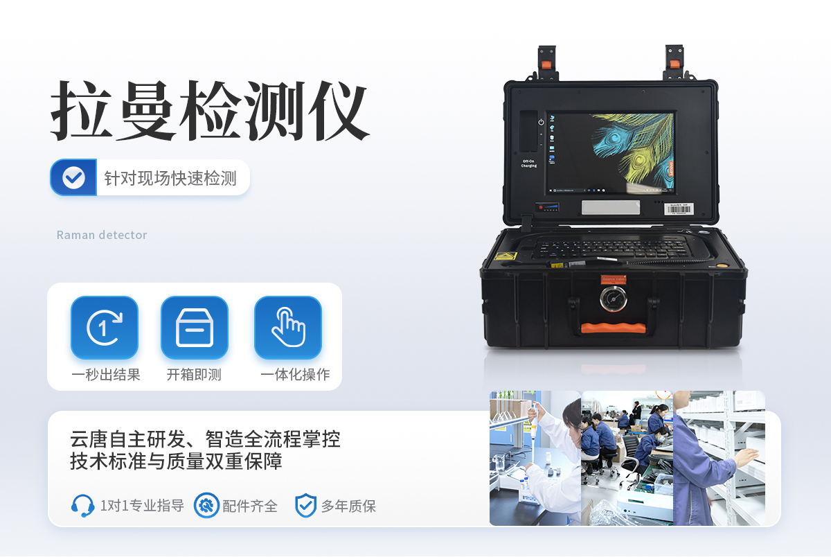 更專業    785nm光源:有效抑制熒光,適合便攜式移動應用    超寬的光譜范圍:檢測物質種類更多    更高的信噪比:超強的微小信號探測能力    優質激光光源:數字可調高功率輸出,窄線寬保障譜圖質量    更便捷    光學聚焦設計:可以隔著塑料袋、玻璃瓶直接檢測    快速自穩定光源:機器啟動無預熱時間,即開即用    超快檢測速度:一秒出結果    便攜式設計:獨立可充電電源供電,隨裝隨走,適合各種現場快檢    更貼合應用    在線譜圖庫:提供各行業應用多維譜圖庫,支持在線升級    專業分析算法:智能解譜,自動匹配,多組分分析    行業應用軟件:提供針對行業專用軟件,支持客戶訂制