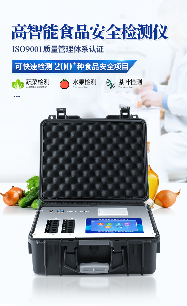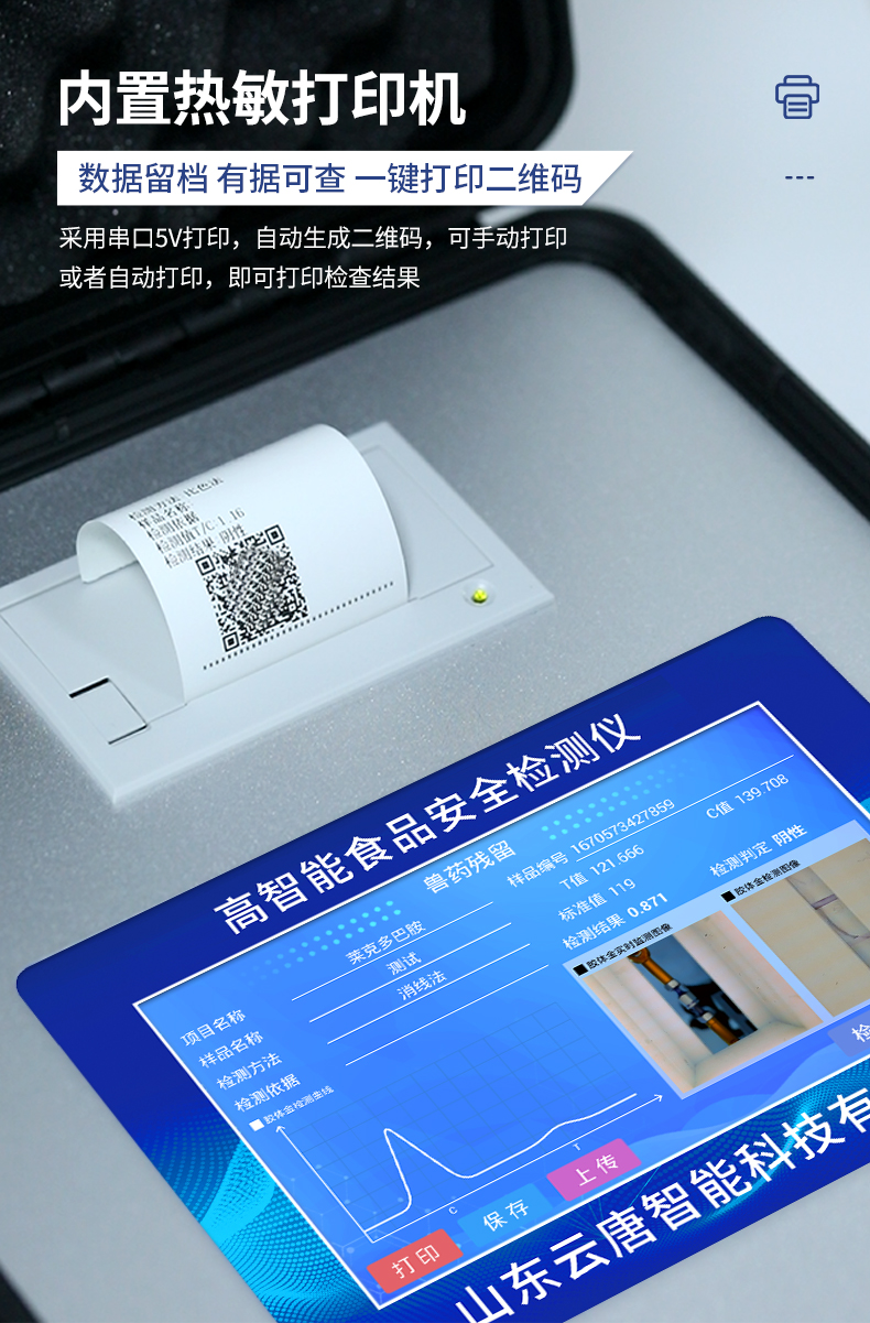| 該儀器通過光電子技術對反應生成物的反射率進行分析測試,定量或定性分析樣品中待測物的含量。 | 安卓智能操作系統,7英寸高靈敏真彩觸摸屏,更加**和人性化操作, | 儀器具有4G無線聯網、wifi聯網上傳、GPRS無線遠傳功能,快速上傳數據。 | 便攜式儀器,便于現場攜帶操作,主機重量不大于3kg。 | 具有可見光光源,可檢測可見光信號,檢測值0~30000。 | 具有常用打印機數據線接口,直接打印結果;配備USB接口,可連接網絡。 | 具有多個食品安全檢測項目,開放平臺,可以增減檢測項目。 | 檢測通道:12個檢測通道,可以同時測試多個樣品,每個樣品由程序控制分別獨立工作,不會互相干擾。 | 以模擬反射率的標準片為50%附近時為代表,精密度CV值≤0.8%。 | 供電電源:(220±22V)~50Hz±1Hz,供電電源電壓波動不應超過220V AC±10%。 | 內置打印機,實時打印檢測結果。內置大容量電池,便于現場執法檢測。 | 高靈敏度,高檢測精度,高重復性精度,掃描式高精度光學傳感器。 | 機身儲存上萬條檢測結果,也可以導出儲存。 | 開放端口,可連接監管平臺數據庫,界面有上傳操作。 |