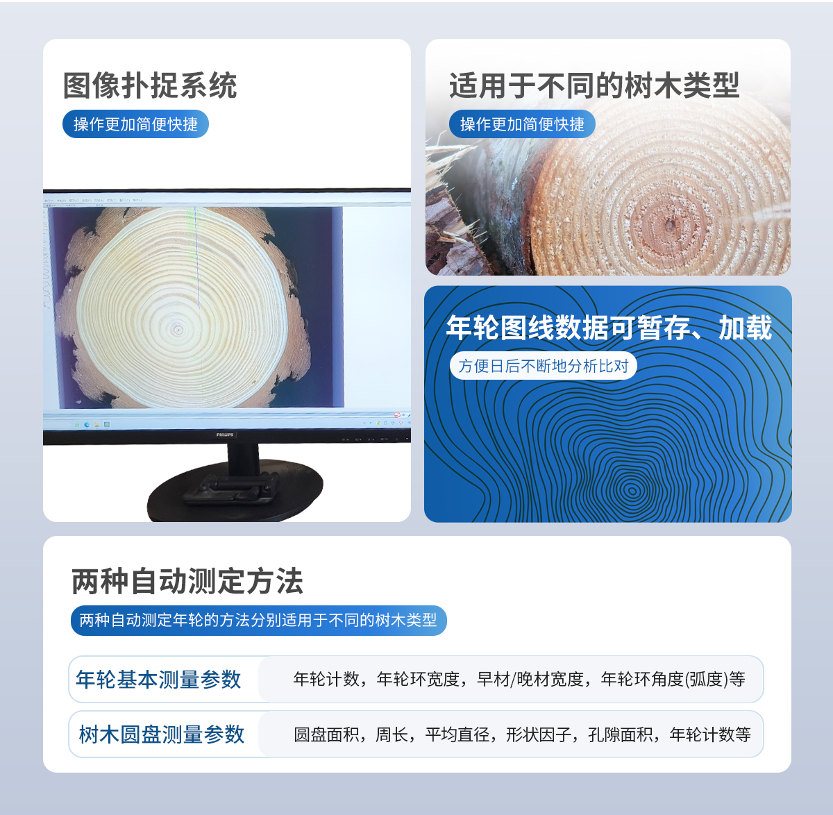 年輪圖像分析系統是一款多平臺圖象分析系統,與掃描儀匹配,專門對盤狀的木材截面或柱狀的生長錐樣本進行樹木年輪的測量。大型木材樣本可在不同部位多次分別成像;特殊的樹芯定位器用以放置柱狀樣本;兩種自動測定年輪的方法分別適用于不同的樹木類型;人工輔助的圖像識別校正和遺漏像素添加功能;此外,可自動設置裂縫與年輪角度的切線,以保證測量的精準性;另外,附加功能可進行植物的標準生長分析,如莖干平均半徑、直徑以及總體截面積;樹木高度、體積、樹齡等。對于所分析的年輪圖像可同時顯示如下參數:年輪寬度、早材/夏材寬度、年輪**/*小密度/平均密度、早材/夏材等。