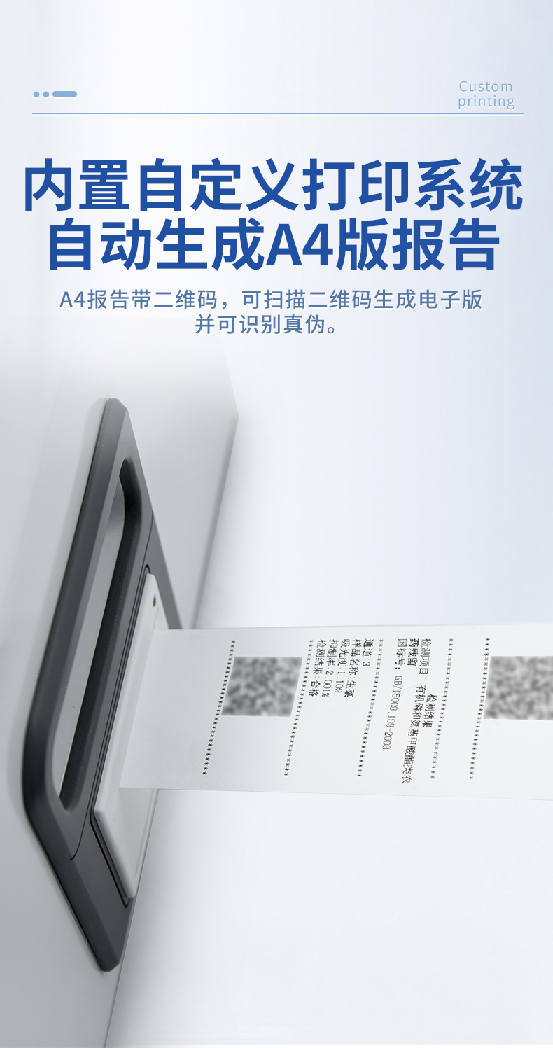 | 1. 試劑位置:3個 | 2. 檢測形式:旋轉48通道比色盤,可任意選擇檢測通道,自動對應選擇通道。 | 3. 系統配置:10.1寸高清液晶觸摸屏,采用ARM Cortex-A7,RK3288/4核處理器,運行內存1GB。Android7.1.1 系統分辨率1280×800。 | 4.恒溫系統:具有自動加溫溫控系統,精準恒溫37℃,精度±0.1℃。 | 5.添加系統:儀器按照試劑要求自動、按時、按量加入試劑,并且自動對未正常放置的樣本或異常的樣本進行檢查并提示。 | 6.清洗功能:儀器具備回流及自動清洗管路功能,避免試劑污染。 | 7.混勻功能:設備具備自動混勻功能。 | 8.光源校準:設備可自動校準,確保檢測準確度。 | 9.實時監控:儀器測試過程中屏幕顯示運行狀態,可實時查看。 | 10.數據存儲:內部存儲16GB,可存儲500萬條數據。 | 11.樣品多選功能:設備具備樣品一鍵多選功能,選擇樣品自動匹配檢測通道。 | 12.項目預設:可提前設置單個及多個相同或不相同的檢測任務,可單次或者多次調取,減少檢測時間。 | 13.自定義打印系統:內置自定義打印系統,可按需靈活設置開啟或關閉:產品合格證(國家農業部標準),二維碼,抽樣信息、檢測信息,受檢信息等信息的打印。 | 14.A4版本報告打印功能:設備可自動生成A4版報告,A4報告帶二維碼,可掃描二維碼生成電子版,并可識別真偽。 | 15.傳輸方式:儀器配備無線通信模塊: 4G(APN)通訊模塊、Wifi模塊,藍牙傳輸模塊,同時具有USB接口以及RJ45接口能以多種方式實現數據保存和數據傳輸功能,設備數據可以同步上傳至平臺。 | 16.數據監管系統:設備自帶監管平臺,并可同步對接監管平臺,數據可局域網和互聯網數據上傳,檢測結果可直接傳至食品安全監管平臺。達到食品安全問題預估、預警。 | 17.系統遠程更新功能:無需設備返廠,即可遠程實時升級全新系統,節省時間成本及避免運輸造成設備損。 |