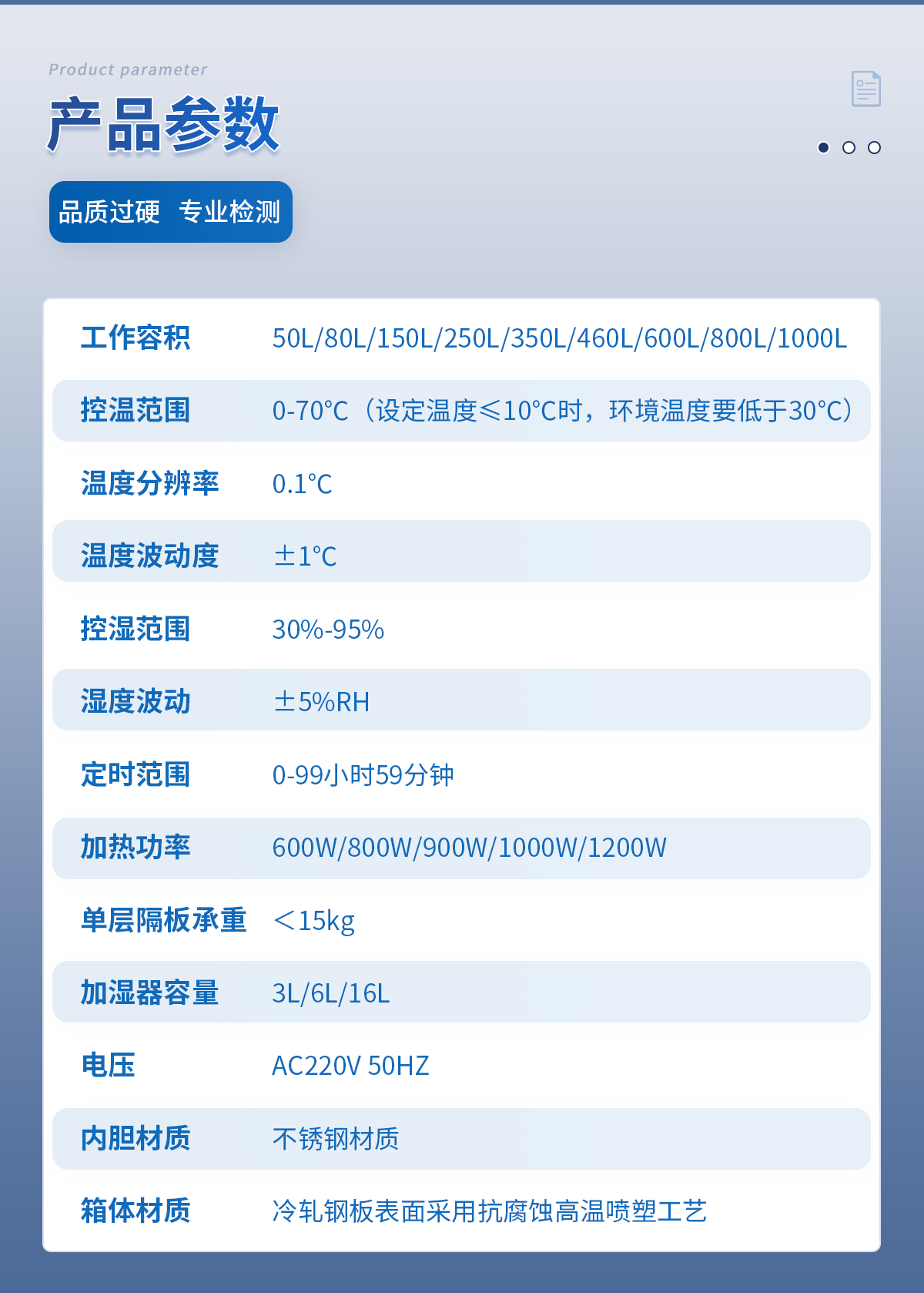 工作容積:50L箱內照明:日光燈控溫范圍:0-70℃(設定溫度≤10℃時環境溫度要低于30℃)程序控制:24段溫度分辨率:0.1℃溫度波動度:±0.5℃控濕范圍:30%-95%定時范圍:0-99小時59分鐘加熱功率:600W內箱尺寸 寬*深*高(cm):40*30*40外箱尺寸 寬*深*高(cm):55*50*97隔板層數(標配):2層層間隔/mm:19卡槽層數:8加濕器容量(標配):3L單層隔板承重:<8kg底部總承重:20kg電壓:AC220V 50HZ整機重量:46kg內膽材質:不銹鋼材質箱體材質:冷軋鋼板表面采用抗腐蝕高溫噴塑工藝