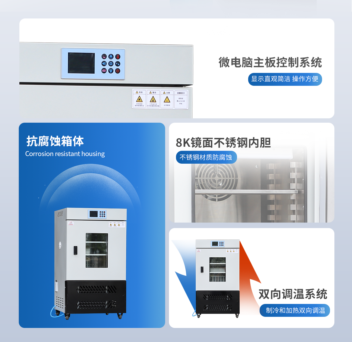 | 工作容積:350L | 箱內照明:日光燈 | 控溫范圍:0-70℃(設定溫度≤10℃時環境溫度要低于30℃) | 程序控制:24段 | 溫度分辨率:0.1℃ | 溫度波動度:±0.5℃ | 控濕范圍:30%-95% | 定時范圍:0-99小時59分鐘 | 加熱功率:900W | 內箱尺寸 寬*深*高(cm):61*51*100 | 外箱尺寸 寬*深*高(cm):74*74*157 | 隔板層數(標配):2層 | 層間隔/mm:38 | 卡槽層數:13 | 加濕器容量(標配):3L | 單層隔板承重:<15kg | 底部總承重:35kg | 電壓:AC220V 50HZ | 整機重量:120kg | 內膽材質:不銹鋼材質 | 箱體材質:冷軋鋼板表面采用抗腐蝕高溫噴塑工藝 |