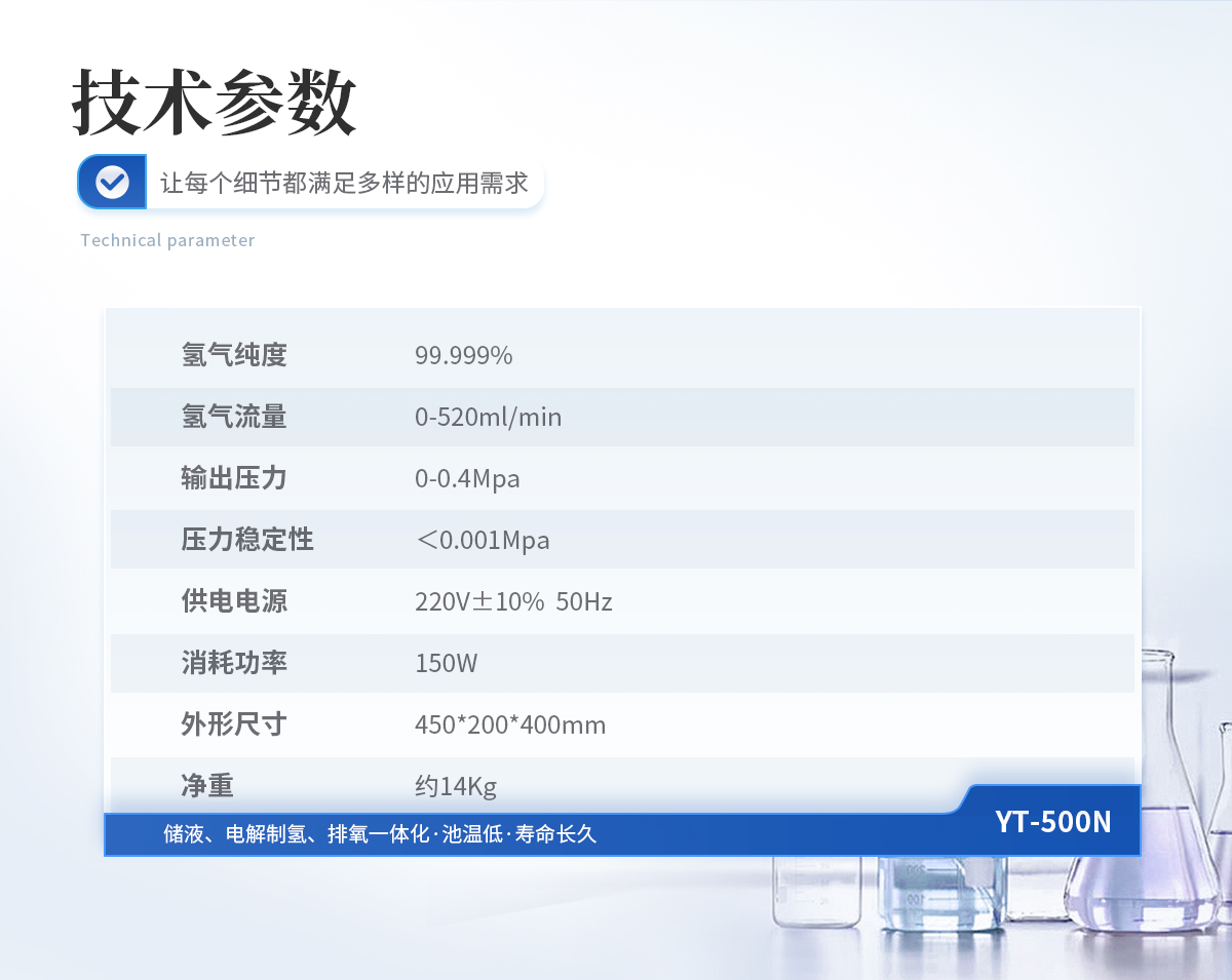 1、氫氣純度: 99.999%    2、氫氣流量: 0-320ml/min    3、輸出壓力: 0-0.4Mpa    4、壓力穩定性:<0.001Mpa    5、供電電源: 220V±10% 50Hz    6、消耗功率: 120W    7、外形尺寸: 450*200*400mm    8、凈重: 約14Kg