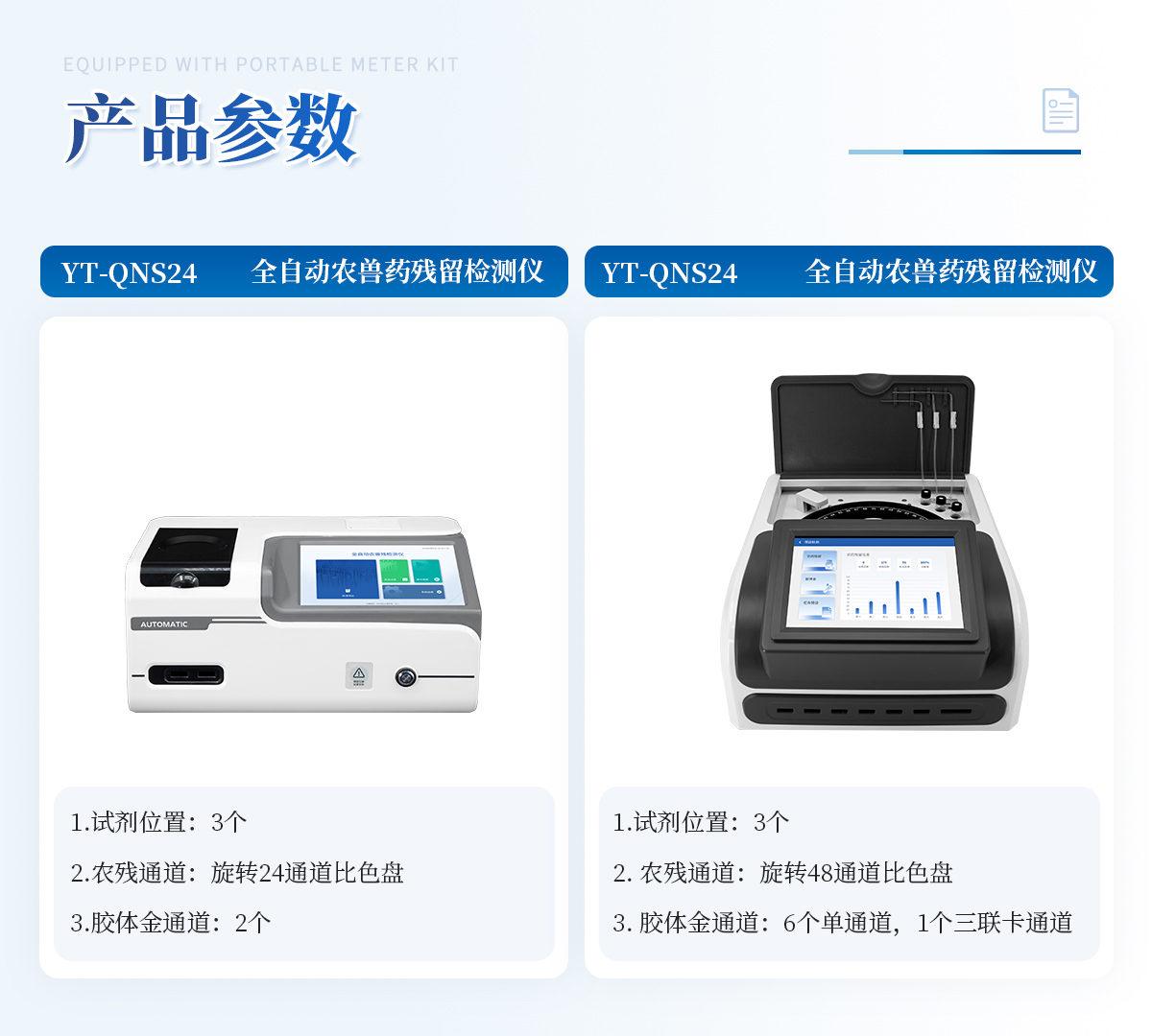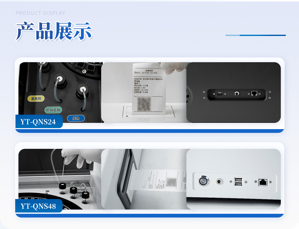 1. 試劑位置:3個2. 農殘檢測盤:旋轉48通道比色盤,可任意選擇檢測通道,自動對應選擇通道。3. 膠體金通道:6個單通道,1個三聯卡通道,可讀取檢測卡結果,自動采集、處理分析,自動判斷檢測結果,并具備自動判空功能。4.系統配置:10.1寸高清液晶觸摸屏,采用ARM Cortex-A7,RK3288/4核處理器,運行內存1GB。Android7.1.1 系統分辨率1280×800。5.恒溫系統:具有自動加溫溫控系統,精準恒溫37℃,精度±0.1℃。 6.添加系統:儀器按照試劑要求自動、按時、按量加入試劑,并且自動對未正常放置的樣本或異常的樣本進行檢查并提示。7.清洗功能:儀器具備回流及自動清洗管路功能,避免試劑污染。8.混勻功能:設備具備自動混勻功能。9.光源校準:設備可自動校準,確保檢測準確度。10.實時監控:儀器測試過程中屏幕顯示運行狀態,可實時查看。11.數據存儲:內部存儲16GB,可存儲500萬條數據。12.樣品多選功能:設備具備樣品一鍵多選功能,選擇樣品自動匹配檢測通道。13.項目預設:可提前設置單個及多個相同或不相同的檢測任務,可單次或者多次調取,減少檢測時間。14.自定義打印系統:內置自定義打印系統,可按需靈活設置開啟或關閉:產品合格證(國家農業部標準),二維碼,抽樣信息、檢測信息,受檢信息等信息的打印。15.A4版本報告打印功能:設備可自動生成A4版報告,A4報告帶二維碼,可掃描二維碼生成電子版,并可識別真偽。16.傳輸方式:儀器配備無線通信模塊: 4G(APN)通訊模塊、Wifi模塊,藍牙傳輸模塊,同時具有USB接口以及RJ45接口能以多種方式實現數據保存和數據傳輸功能,設備數據可以同步上傳至平臺。17.數據監管系統:設備自帶監管平臺,并可同步對接監管平臺,數據可局域網和互聯網數據上傳,檢測結果可直接傳至食品安全監管平臺。達到食品安全問題預估、預警。18.系統遠程更新功能:無需設備返廠,即可遠程實時升級全新系統,節省時間成本及避免運輸造成設備損。