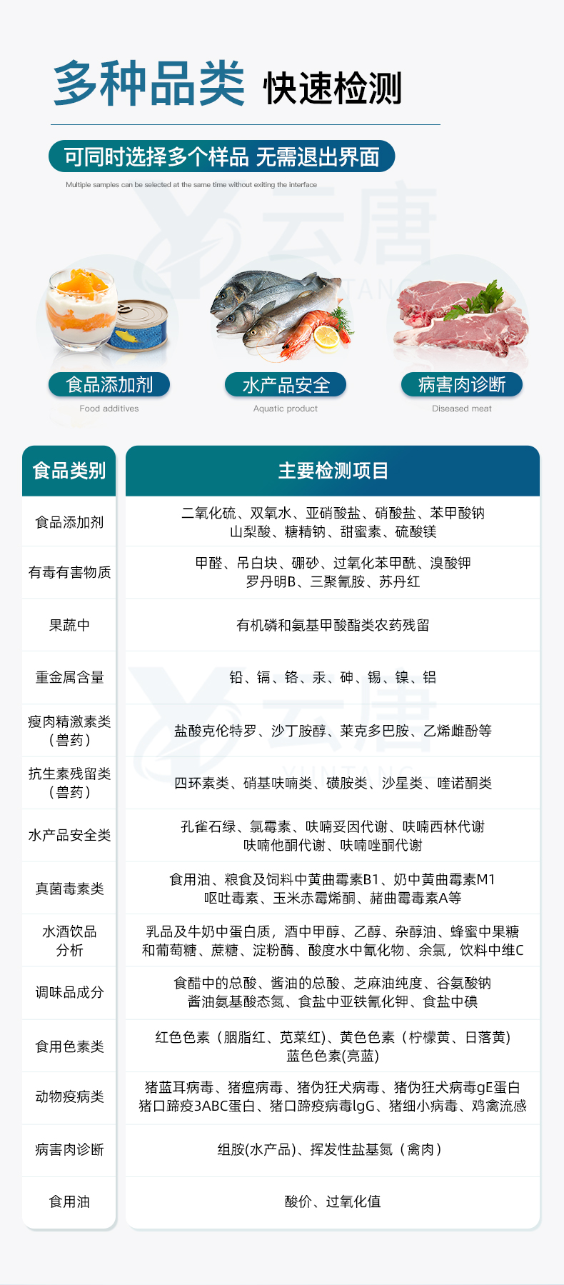 該高智能食品安全檢測儀為集成化食品安全快速檢測分析設備,目前已于食藥監局、衛生部門、高教院校、科研院所、農業部門、養殖場、屠宰場、食品肉產品深加工企業及檢驗檢疫部門等單位廣泛使用。