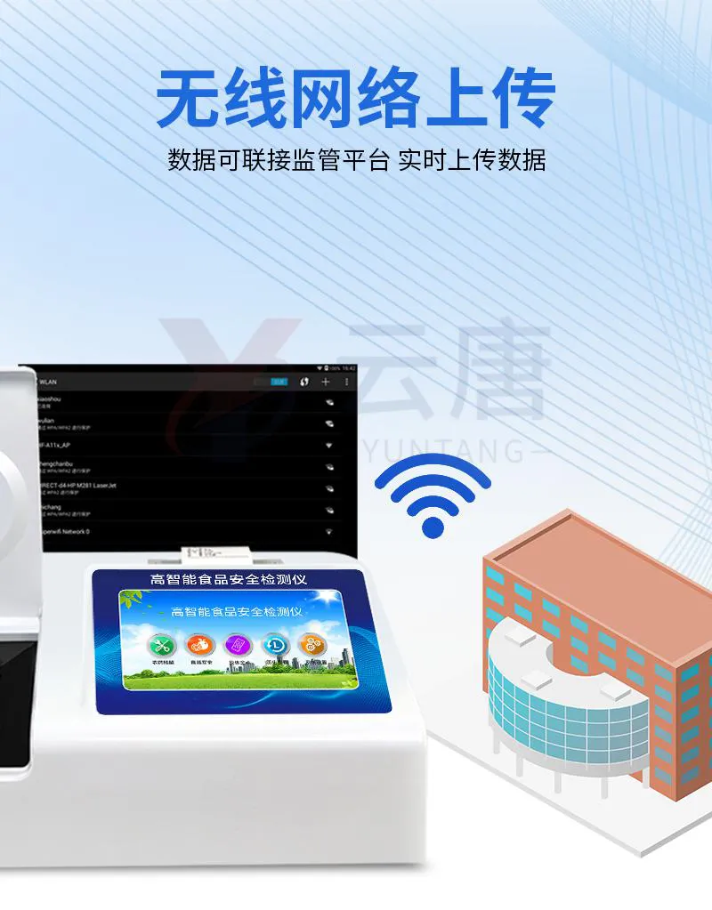 8、儀器帶有監管平臺。數據可局域網和互聯網數據上傳,檢測結果直接傳至食品安全監管平臺。進行區域食品安全監管及大數據分析處理,檢測區域食品安全長短期動態,達到食品安全問題預估、預警