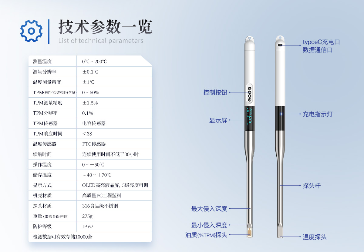 食用油脂是人們攝取能量和營(yíng)養(yǎng)的重要來(lái)源,是加工食品的重要原料。油炸食品以其特有風(fēng)味廣受消費(fèi)者喜歡。用于煎炸的食用油在高溫煎炸過(guò)程中發(fā)生一系列的物理、化學(xué)變化,這些變化會(huì)生成對(duì)身體健康有害的物質(zhì)。目前,煎炸食用油的傳統(tǒng)檢測(cè)方法多為化學(xué)方法,這些方法必須在實(shí)驗(yàn)室內(nèi)由專業(yè)人員操作,費(fèi)時(shí)費(fèi)力,化學(xué)試劑的使用可能會(huì)傷害檢測(cè)人員健康,且化學(xué)廢劑污染了環(huán)境。LH-SYP是一種快速,安全,**食用油品質(zhì)檢測(cè)儀,能夠快速檢測(cè)食用油中的極性化合物組分(TPM)含量。本產(chǎn)品能夠在油溫較高的環(huán)境下使用,適用于各種煎炸的食用油品質(zhì)檢驗(yàn)。