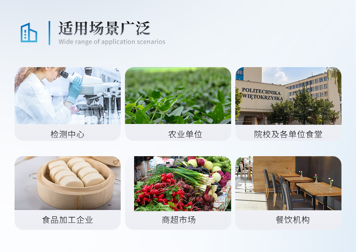 廣泛應(yīng)用于食品深加工企業(yè)、食藥監(jiān)局、商場超市、質(zhì)量監(jiān)督檢驗、工商管理、餐飲檢測、各大食品安全監(jiān)測系統(tǒng)等單位使用。