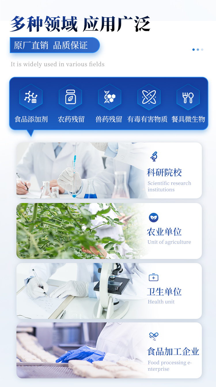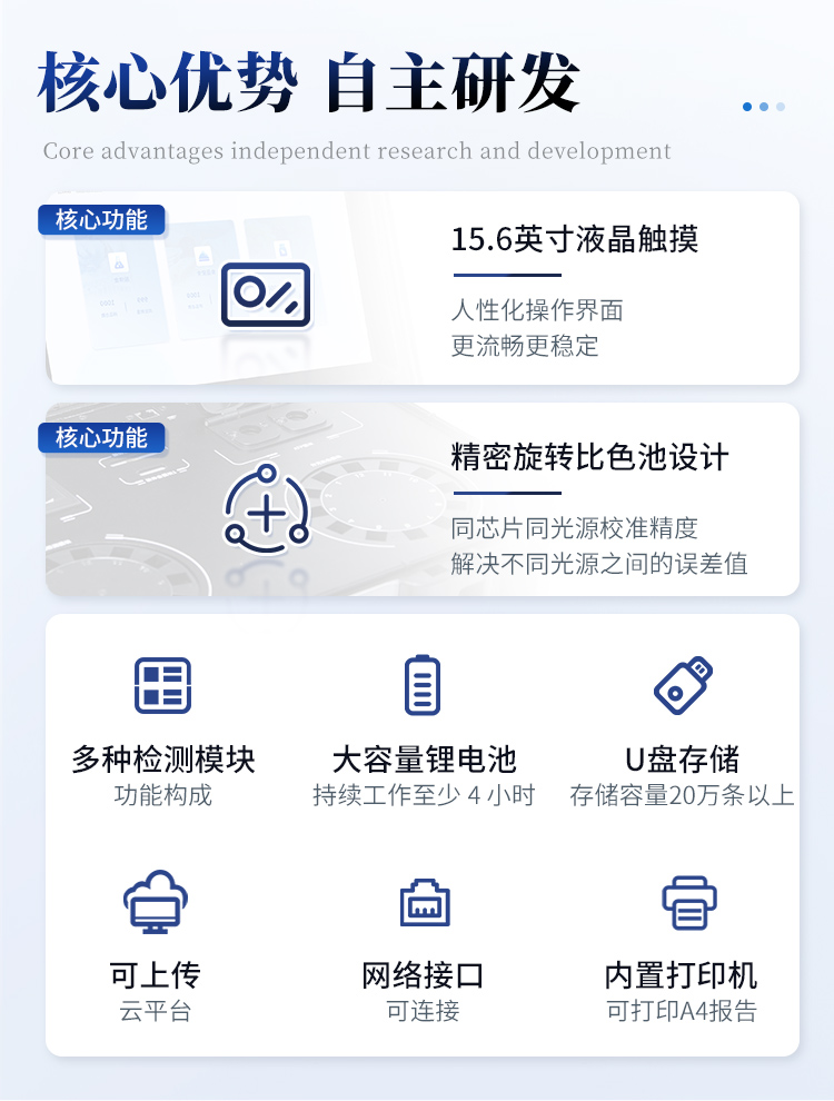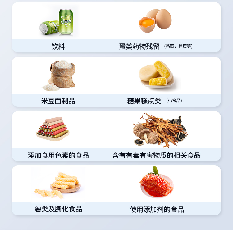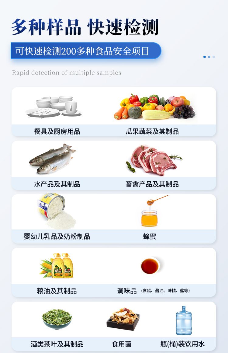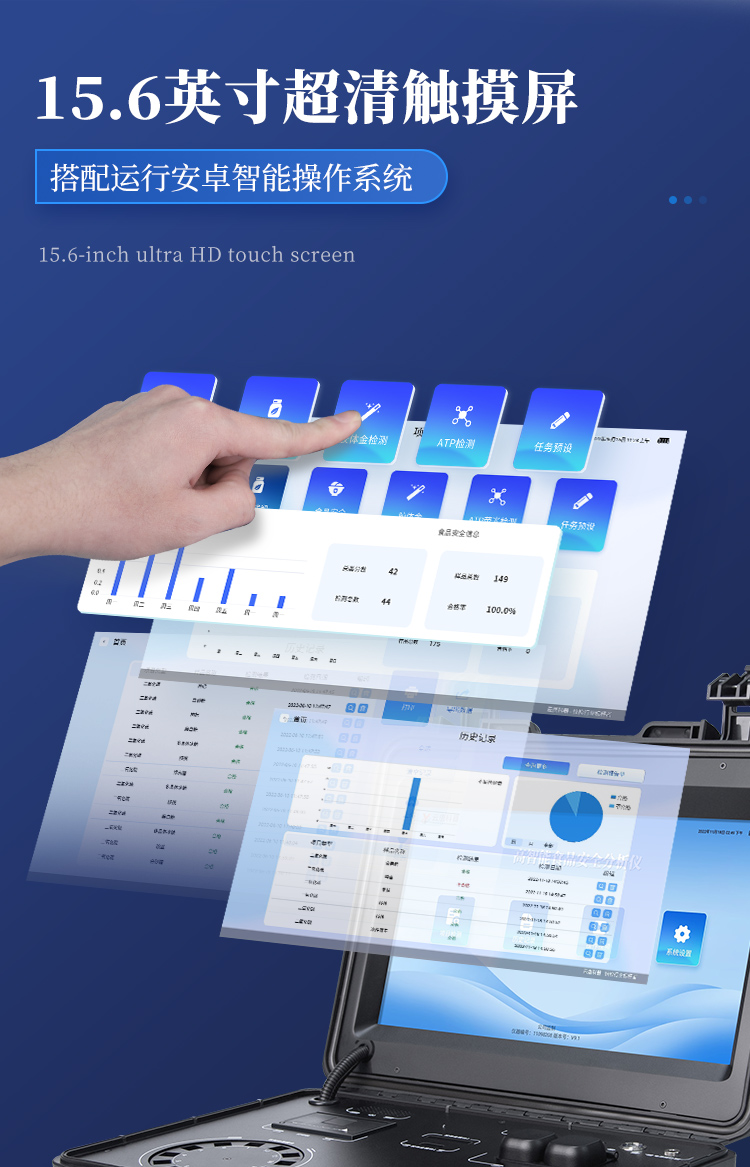 1. 功能構成:主要包括分光光度模塊、新型農殘檢測模塊、膠體金檢測模塊、熒光檢測模塊、數字化管理模塊等,所有模塊集成一體,可快速檢測200多種食品安全項目,如獸藥殘留、農藥殘留、非法添加劑、細菌數值等指標。2. 檢測樣品種類:餐具及廚房用品、瓜果蔬菜及其制品、水產品及其制品、畜禽產品及其制品、嬰幼兒乳品及奶粉制品、蜂蜜、糧油及其制品、調味品(食醋、醬油、味精、鹽等)、酒類茶葉及其制品、食用菌、飲料、蛋類藥物殘留(雞蛋,鴨蛋等)、米豆面制品、糖果糕點類(小食品)、薯類及膨化食品、瓶(桶)裝飲用水、添加食用色素的食品、使用添加劑的食品、含有有毒有害物質的相關食品。3、顯示屏幕:儀器采用15.6英寸液晶觸摸屏顯,搭配運行安卓智能操作系統,主控芯片采用ARM Cortex-A7,RK3288/4核處理器,主頻1.88Ghz,操作方便,性能更強。4、供電模式:儀器交直流兩用,直流12V供電,可連接車載電源,配18ah大容量充電鋰電池,電量可實時顯示,無外部電源條件下可持續工作至少 4 小時。5、檢測通道:≥24通道;采用精密旋轉比色池設計,使用同芯片同光源校準精度,解決不同光源之間的誤差值,更加準確**,采用高精度進口四波長冷光源,每個通道均配置 410、520、590、630nm 波長光源,標配**的光路切換裝置,專利光路切換功能可實現64波長,并且所有檢測項目可實現所有通道同時檢測.6、通訊接口:配備無線通信模塊、4G(APN)通訊模塊、藍牙傳輸,同時具有雙USB接口以及RJ45網線接口,可以多方式實現數據保存及數據傳輸。7、存儲方式:支持U盤存儲,兩個標準USB接口,免驅動安裝。檢測結果存儲容量20萬條以上,可生成Excel表格進行拷貝,并具有登錄保護功能。8、操作系統:儀器可在同一檢測界面自動對應相關檢測通道,一次性選擇不少于11個樣品名稱,無需退出界面,節省操作時間。并可以對每個通道屬性和樣品信息單獨進行編輯,例如送檢單位、人員,檢測人員等,打印時勾選打印顯示。9、數據集成系統:設備首頁自動匯總分析檢測數據,包含:周檢測數據、月檢測數據,全部檢測總數量,包含檢測總數,合格數,不合格數,以及相關柱形分析圖,各項檢測數據一目了然,無需電腦查詢,更加快捷直觀。10、數據庫系統:十幾項數據庫分類管理儀器:包含項目類型、項目數據、檢測數據、歷史記錄、國標信息、曲線信息、采樣信息、檢測信息、受檢信息、復核信息、圖表信息、光源校準信息、打印樣式信息、樣品庫信息等等,數據庫之間互相協調聯動保證數據的真實完整性。同時產品數據庫以及歷史檢測記錄支持一鍵檢索功能。11、限量規判系統:具有限量查詢、添加物質合規判定系統。檢測出結果后,系統自動調用系統數據庫中相關國標進行比對判定,客觀顯示判定結果是否合格。12、項目預設系統:儀器具有任務預設模塊,一鍵提前預設,給出方便快捷的新檢測方案,每一個任務分別可以設置不同的樣品、批次、編號、來源、備注、抽樣信息、檢測信息、受檢信息、復核信息等更多信息。樣品送檢時一鍵調取保存信息,并可多次調取,適用于大批量檢測業務,可以大大提高檢測效率。13、數據監管系統:同步對接監管平臺,數據可局域網和互聯網數據上傳,檢測結果可直接傳至食品安全監管平臺。進行區域食品安全監管及大數據分析處理與數據統計,監測區域食品安全長短期動態及問題預估、預警。14.1、全新打印系統:內置全新打印機,新創自定義打印方式,可按需靈活勾選控制:產品合格證(國家農業部標準要求),二維碼,抽樣信息、檢測信息,受檢信息、復核信息、抽樣日期、檢測日期等信息的打印。14.2、A4紙版本報告打印功能:設備擁有兩種結果展示方式,可以自動生成A4打印模板和小票打印模板兩種樣式,可通過WiFi及網線等方式連接外置打印機可進行打印。15、膠體金檢測模塊:采用單通道CMOS成像處理技術及膠體金免疫層析技術,可讀取膠體金卡數據,自動采集、處理分析,將檢測結果顯示,并可根據參考限值自動判斷檢測結果,可檢測常見的獸藥殘留、生物毒素、抗生素、違禁添加物等。15.1、可即時檢測單聯卡及三聯卡;15.2、檢測通道:2個通道;15.3、檢測方式:消線法和比色法; 15.4、顯示模式:陰性或陽性;15.5、曲線形式:插入式掃描方式,顯示金標卡圖像,實時生成、識別CT曲線圖,無需手動調整。兼容市場上其他金標卡,使用耗材不受限制。16、熒光檢測模塊:快速檢測水質中微生物、固體物細菌含量。利用“熒光素酶—熒光素體系”快速檢測三磷酸腺苷(ATP)。以ATP含量表明樣品中微生物與其他生物殘余得多少,用于判斷衛生狀況。 適用于食品、餐具、手、液體等表面及水質潔凈度的檢測。16.1、檢測通道:雙通道  檢測精度:**********16.2、檢測范圍:0 to 99999 RLU16.3、檢測時間:15 秒16.4、檢測干擾:±5﹪或±5 RLU16.5、操作溫度范圍:5℃到 40℃16.6、操作濕度范圍:20—85﹪ 16.7、開機 30 秒自檢、內置自校光源、自動判斷合格與不合格、自動統計合格率 。17、儀器具備遠程升級功能,可定向分客戶分儀器更新,開機后自動更新,并可持續性免費更新系統版本,無需像傳統產品返廠更新,節省時間及人力成本并避免了物流運輸返廠升級導致設備損壞的潛在風險。