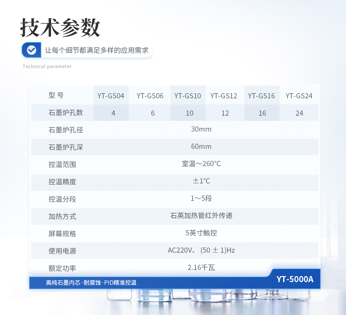 石墨爐孔:孔徑30mm,孔深60mm,孔數4×4 控溫范圍:室溫~260℃ 控溫精度:±1℃ 控溫分段:1~5段 加熱方式:石英加熱管紅外傳遞 屏幕規格:5寸觸控 主機外型尺寸:寬477mm×深460mm×高168mm 使用電源:AC220V、 (50 ± 1)Hz 額定功率:2.16千瓦