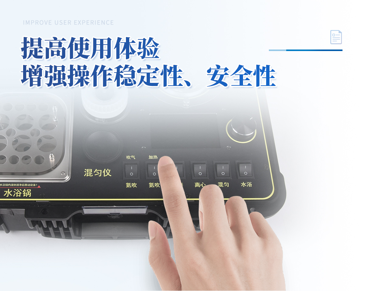 1、功能緊湊,集成五種樣品前處理常用的功能,完成樣品一站式處理。2、結構穩固,機箱采用***工程塑料,具備**的抗沖擊性、耐腐蝕性、便攜性。3、操作穩定,機器采用五寸全彩色液晶屏,功能指示性強,用戶操作均為實體開關,杜絕佩戴手套和液體噴濺時的操作失效。