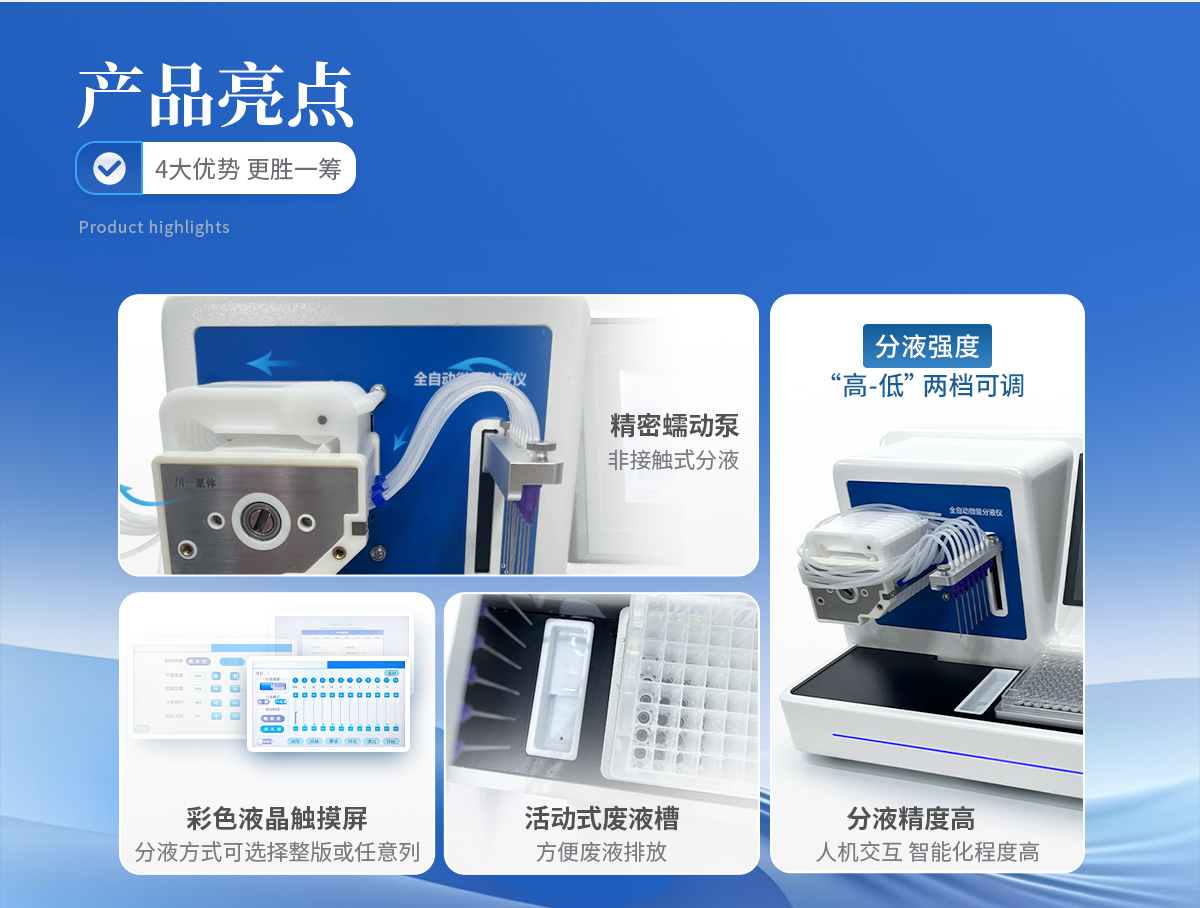 全自動(dòng)微量分液儀(以下簡稱“分液儀”)是一種配備高精度蠕動(dòng)泵的分液設(shè)備,能夠快速、**、一致的完成自動(dòng)化分液操作。可廣泛應(yīng)用于疾控篩查、食品檢測、動(dòng)物檢疫、生命科學(xué)研究等領(lǐng)域。解放實(shí)驗(yàn)員雙手,在提**率的同時(shí)避免錯(cuò)誤。