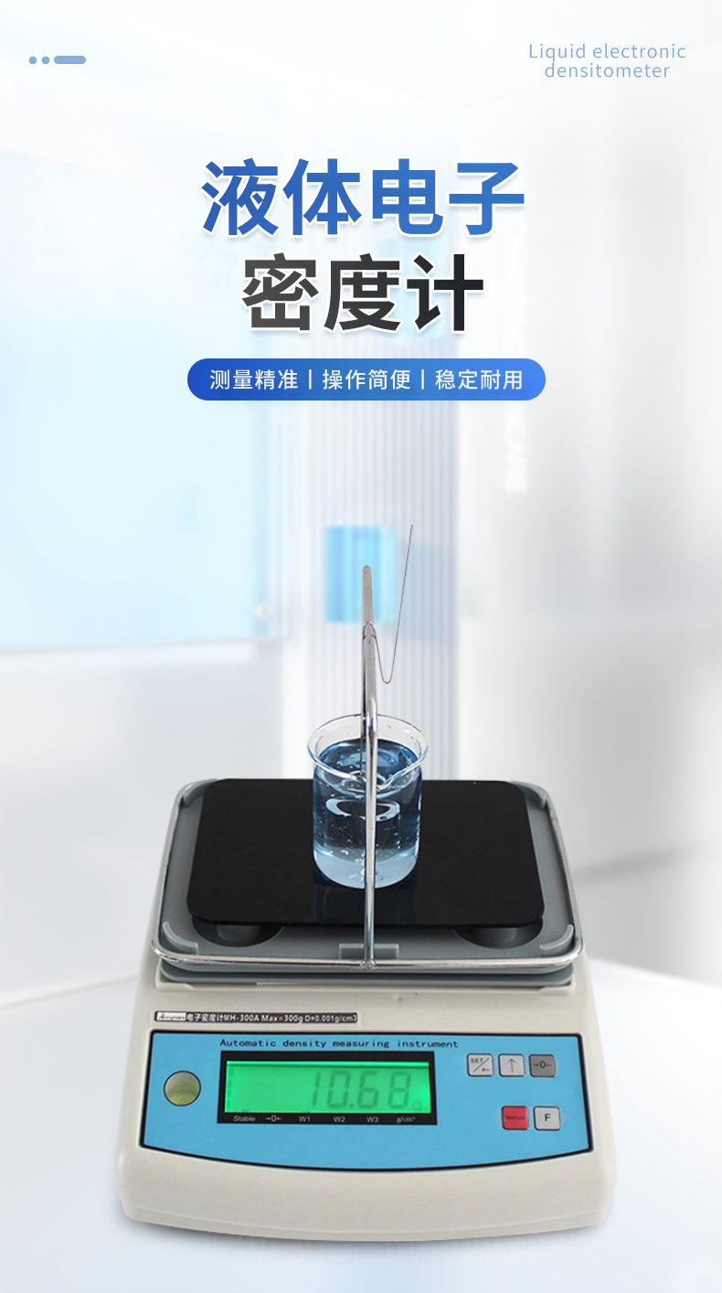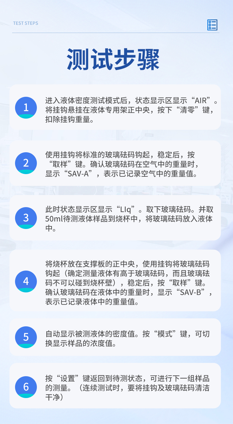| 1、進入液體密度測試模式后,狀態顯示區顯示“AIR”。 將掛鉤懸掛在液體專用架正中央,按下“清零”鍵,扣除掛鉤重量。 | 2、使用掛鉤將標準的玻璃砝碼鉤起,穩定后,按“取樣”鍵。確認玻璃砝碼在空氣中的重量時,顯示“SAV-A”,表示已記錄空氣中的重量值。 | 3、此時狀態顯示區顯示“LIq”。取下玻璃砝碼。并取50ml待測液體樣品到燒杯中,將玻璃砝碼放入液體中。 | 4、將燒杯放在支撐板的正中央,使用掛鉤將玻璃砝碼鉤起(確定測量液體有高于玻璃砝碼,而且玻璃砝碼不可以碰到燒杯壁),穩定后,按“取樣”鍵。確認玻璃砝碼在液體中的重量時,顯示“SAV-B”,表示已記錄液體中的重量值。 | 5、自動顯示被測液體的密度值。按“模式”鍵,可切換顯示樣品的濃度值。 | 7、按“設置”鍵返回到待測狀態,可進行下一組樣品的測量。(連續測試時,要將掛鉤及玻璃砝碼清潔干凈) | 儀器尺寸:195*220*190mm | 包裝尺寸:430*200*360mm | 包裝重量:4kg |