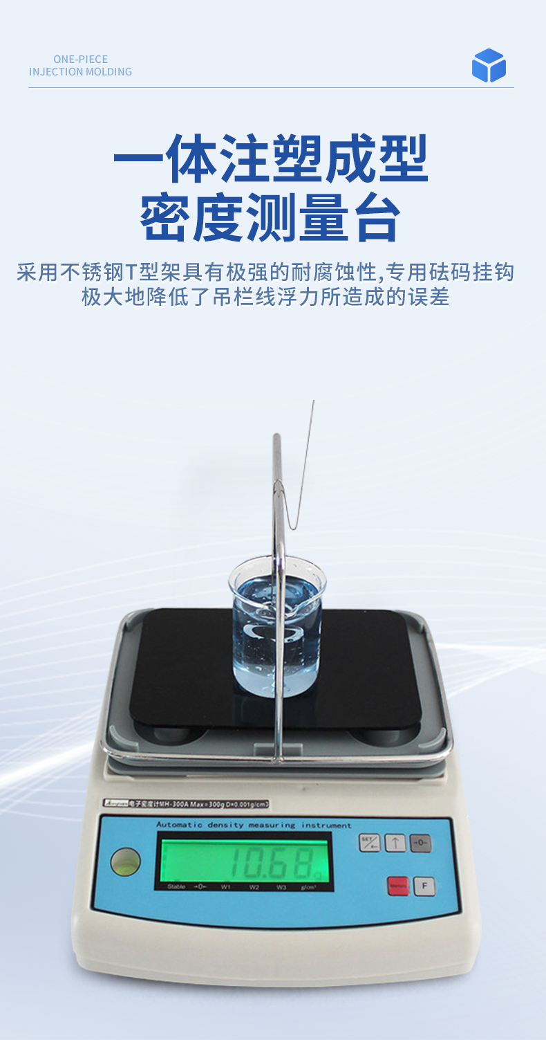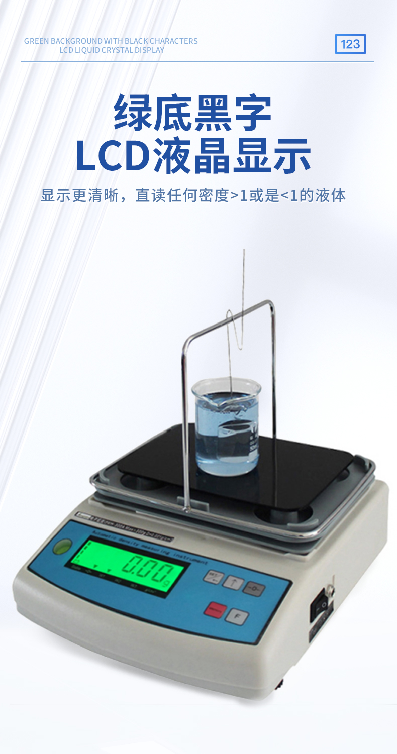 | 1.直讀任何密度>1或是<1的液體.> | 2.具有溫度補償設定、溶液補償設定功能,更人性化的操作、更符合現場作業需求 | 3.密度測量臺一體注塑成型,安裝方便快速,使用時間更長. | 4.采用不銹鋼T型架具有極強的耐腐蝕性,專用砝碼掛鉤極大地降低了吊欄線浮力所造成的誤差 | 5.具有密度上、下限功能,可判定待測物的比重合格與否。設有蜂鳴器裝置 | 6.內置蓄電池,選配防風罩,更適合現場測試. | 7. 綠底黑字LCD液晶顯示,顯示更清晰 |