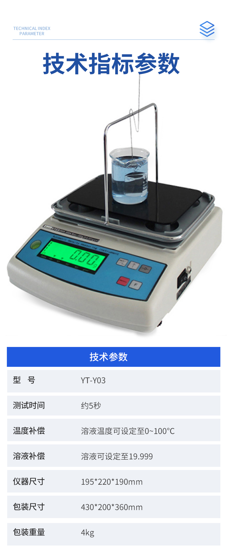 | YT-Y01 稱重范圍:0.01-300g 稱重精度:0.01g 密度精度:0.001g/cm3 | YT-Y02 稱重范圍:0.01-600g 稱重精度:0.01g 密度精度:0.001g/cm3 | YT-Y03 稱重范圍:0.005-300g 稱重精度:0.005g 密度精度:0.0001g/cm3 | 測試種類 化工溶液、化工助劑、現代能源、石油燃燒、藥劑、油漆涂料、瀝青、食用油等各種液體 | 測試時間 約5秒 | 顯示值 密度、體積 | 溫度補償 溶液溫度可設定至0~100℃ | 溶液補償 溶液可設定至19.999 |