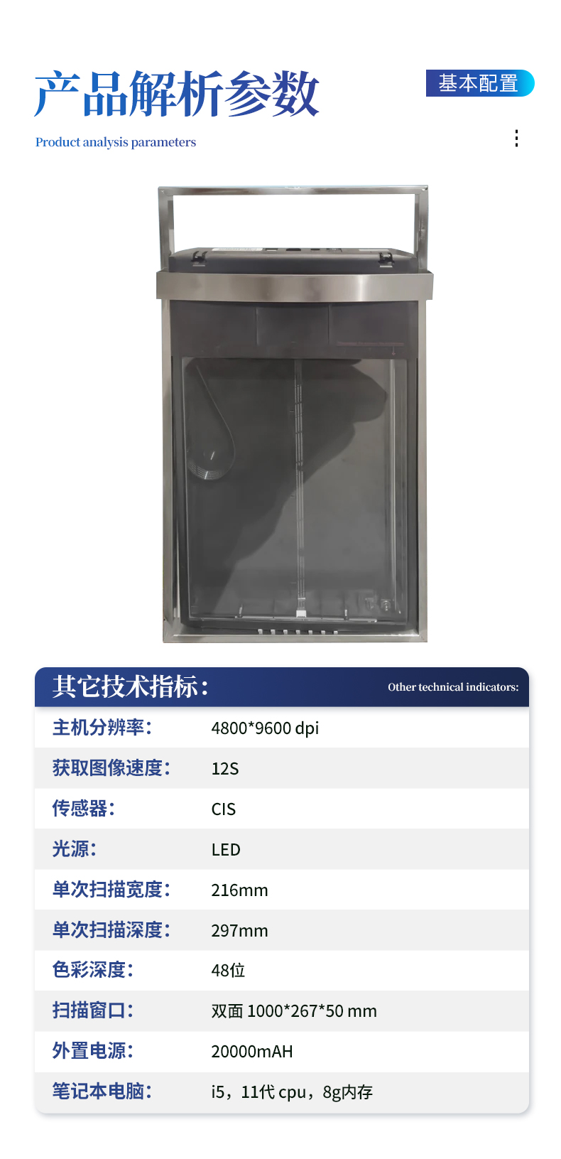 主機分辨率:4800*9600 dpi    獲取圖像速度:12S    傳感器:CIS    光源:LED    單次掃描寬度:216mm    單次掃描深度:297mm    色彩深度:48位    掃描窗口:雙面 1000*267*50 mm    外置電源:20000mAH    筆記本電腦:i5,11代 cpu,8g內存