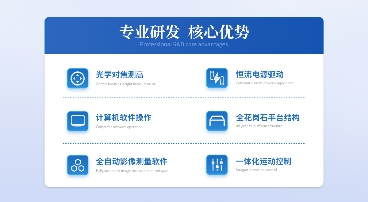 l 儀器采用700TVL  COMST模擬信號相機及手動卡位變焦物鏡作為測量瞄準系統;l 由二坐標工作臺、電子光柵尺與數據處理器組成數字符測量及數據處理系統;l 采用花崗石平臺,外觀簡潔大方;l 表面光由環形LED光源組成,每一組均為恒流電源驅動,連續可調;l 儀器具有多種數據處理、顯示、輸入、輸出功能,使測量與辦公完全結合在一起;l 儀器配合計算機使用,與計算機連接后,采用2D影像測量儀專用軟件測繪圖形進行處理及輸出;