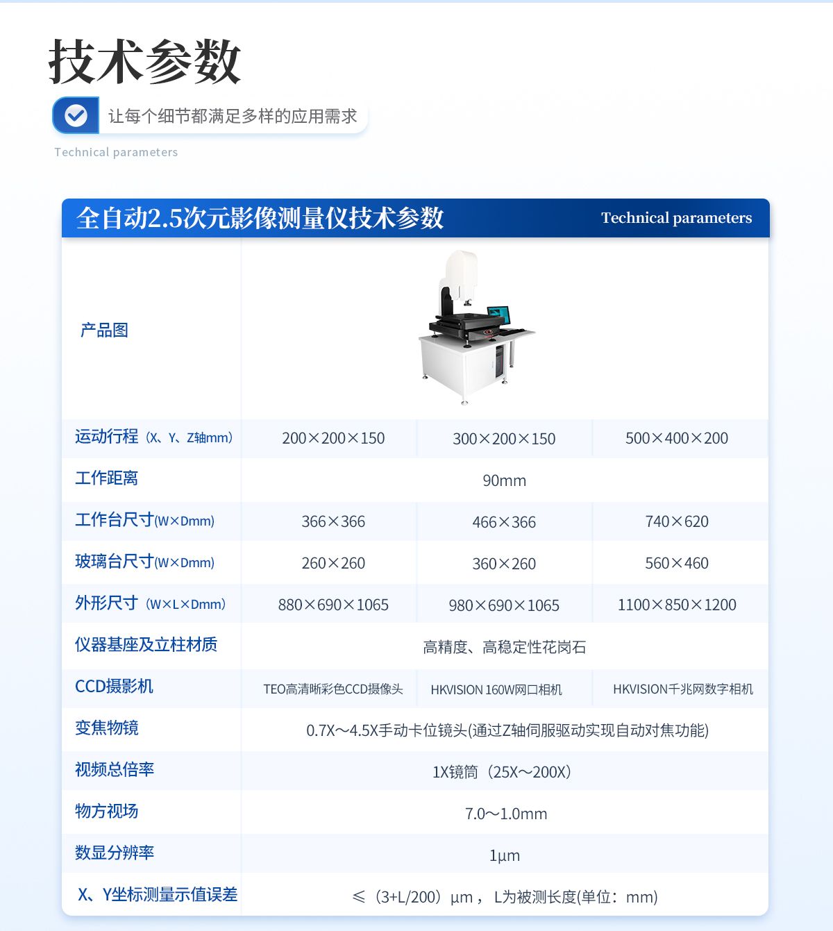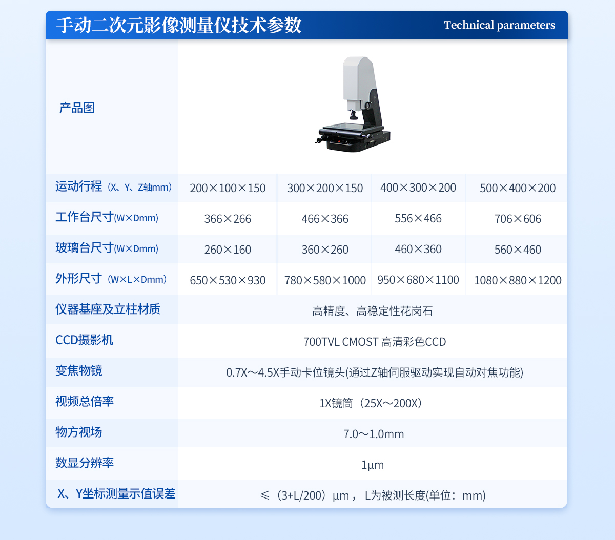 l 運動行程(X、Y、Z軸mm):500×400×200l 工作臺呎寸(W×Dmm):     706×606l 玻璃臺呎寸(W×Dmm):     560×460l 外形尺寸(W×L×Dmm):  1080×880×1200l 工作距離:90mml 儀器基座材質:高精度、高穩定性花崗石l CCD攝影機:700TVL  COMST模擬信號相機l 變焦物鏡:  0.7X~4.5X手動卡位鏡頭l 視頻總倍率:1X鏡筒(25X~200X)l 物方視場:  7.0~1.0mml 數顯分辨率:1μml X、Y坐標測量示值誤差≤(3+L/200)μm , L為被測長度(單位:mm)