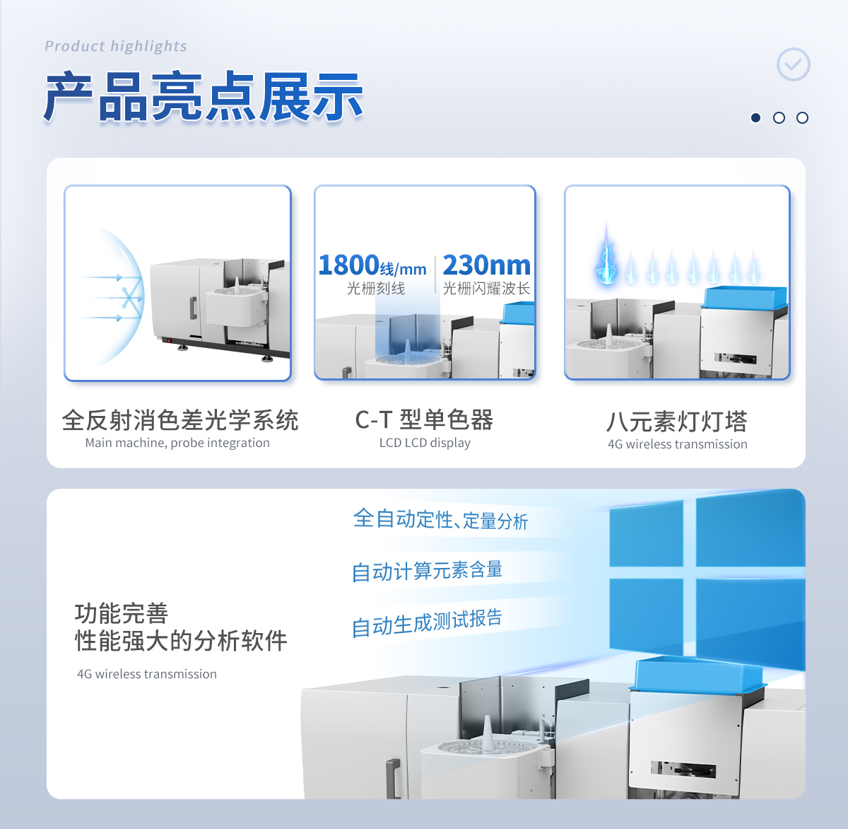 采用 1800 L/mm、閃耀波長 230nm 光柵作為分光系統(tǒng)。 3、八元素?zé)魺羲?br/>八燈座設(shè)計,八路獨立燈電源,一燈工作,可以實現(xiàn)七燈預(yù)熱,節(jié)省了換燈和預(yù)熱時間。 4、全自動化設(shè)計
