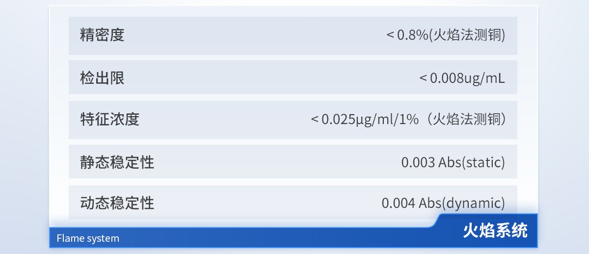 整機單色器類型:切爾尼-特納型(Czerny-Turner) 波長范圍:190nm~900nm 波長準確度:±0.25nm 波長重復性:< 0.05nm 光譜帶寬:0.1/0.2/0.4/0.7/1.4 nm 五檔自動切換 火焰系統 精密度:< 0.8%(火焰法測銅) 檢出限:< 0.008ug/mL 特征濃度:< 0.025μg/ml/1%(火焰法測銅) 靜態穩定性: 0.003 Abs(static) 動態穩定性: 0.004 Abs(dynamic) 石墨爐系統 石墨爐控溫范圍:室溫--3000℃ 石墨爐升溫速率:3000℃/s 石墨爐測鎘(Cd)精密度:≤ 2% 石墨爐測鎘(Cd)精密度:≤ 5% 石墨爐測鎘(Cd)特征量:≤ 0.5pg 石墨爐測鎘(Cd)檢出限:≤ 1pg 石墨爐測鎘(Cd)檢出限:≤ 2pg 電源:220V±22V,50Hz±1Hz,5kW(峰值)